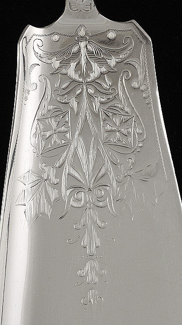 Presented is a great antique coin silver fish server made by Gorham Manufacturing Company. The fish server is done in the Olive pattern which was first produced in 1865. The blade is beautifully engraved with flowers, scrolls and leaves. The end of the handle is monogrammed with a W in script.