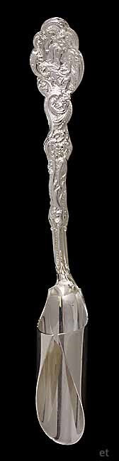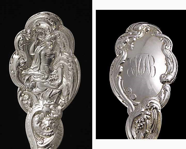 The cheese scoop is marked on the reverse with Gorham’s old company hallmarks, Sterling, and Copyrighted.