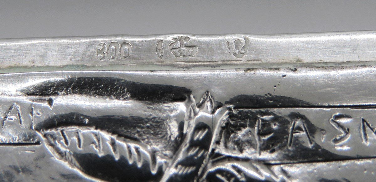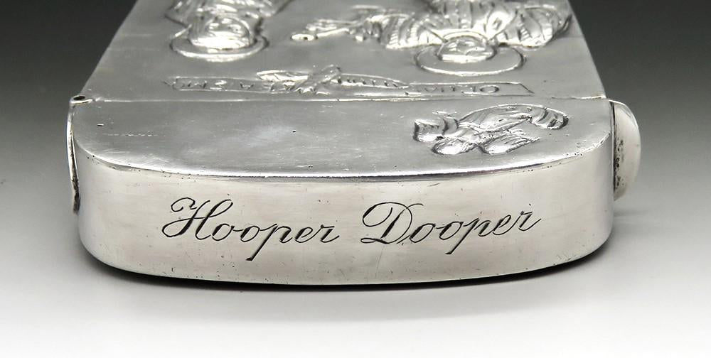 The top of the case is engraved with the name Hooper Dooper. The lip of the case bears the German crown and crescent moon mark, 800 for the silver purity and Hanau pseudo marks for Neresheimer.