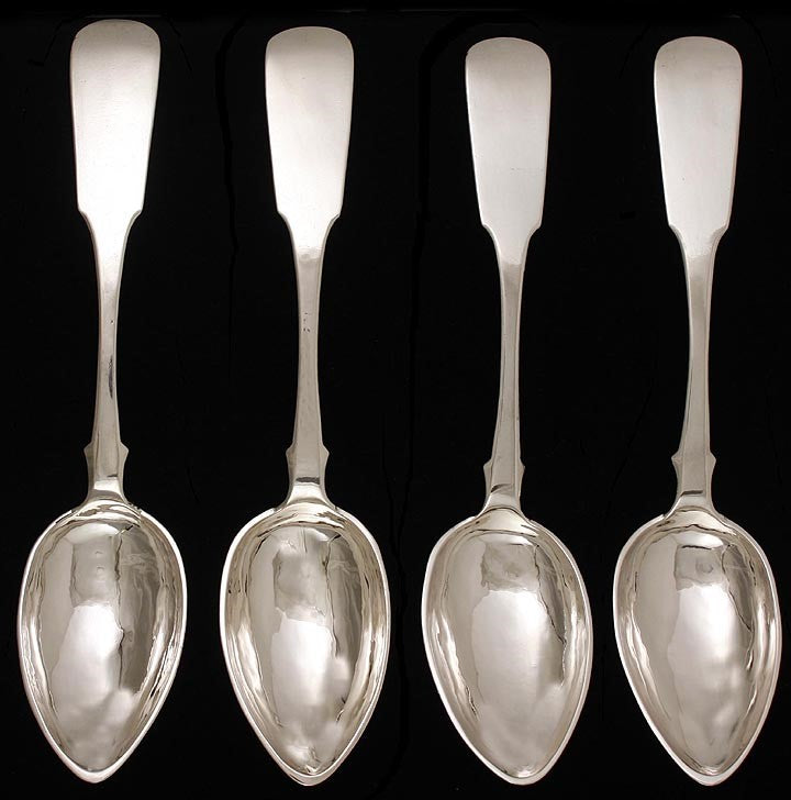 Presented is a fine old set of 4 Russian silver spoons. The spoons are done in the classic Fiddle pattern. They have not been monogrammed or engraved. They are quite large, and would be perfect for use as serving spoons!