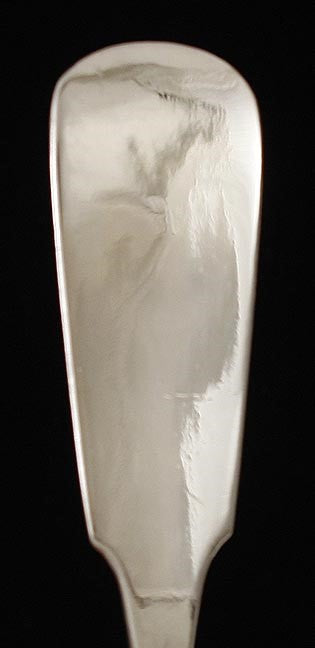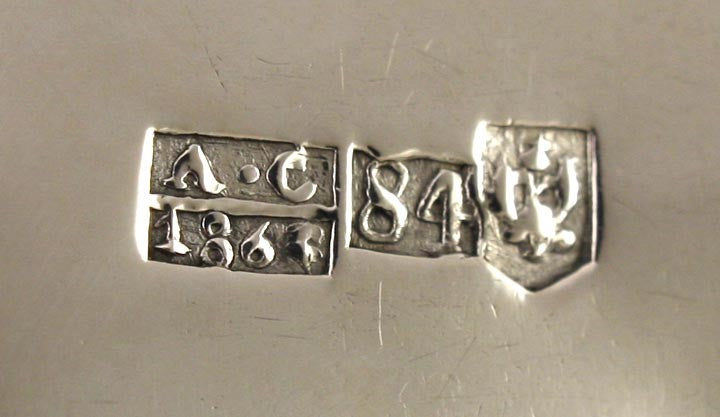 Each spoon is hallmarked on the reverse with the 84 mark for Russian 875 purity silver, an assay master’s mark of AC, and a date of 186?. We cannot discern the last number of the date. Since these spoons were made in the 1860s they are at least 140 years old. The spoons also have a city mark which appears to be for the city of Minsk.