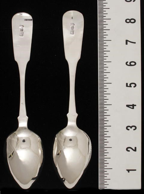 The spoons are in good overall condition. They have some light surface wear commensurate with their age, and a few dents have been professionally removed from the bowls and the tops of some of the handles. This is minor. There are no splits, no monograms, no monogram removals, no breaks, and no repairs.