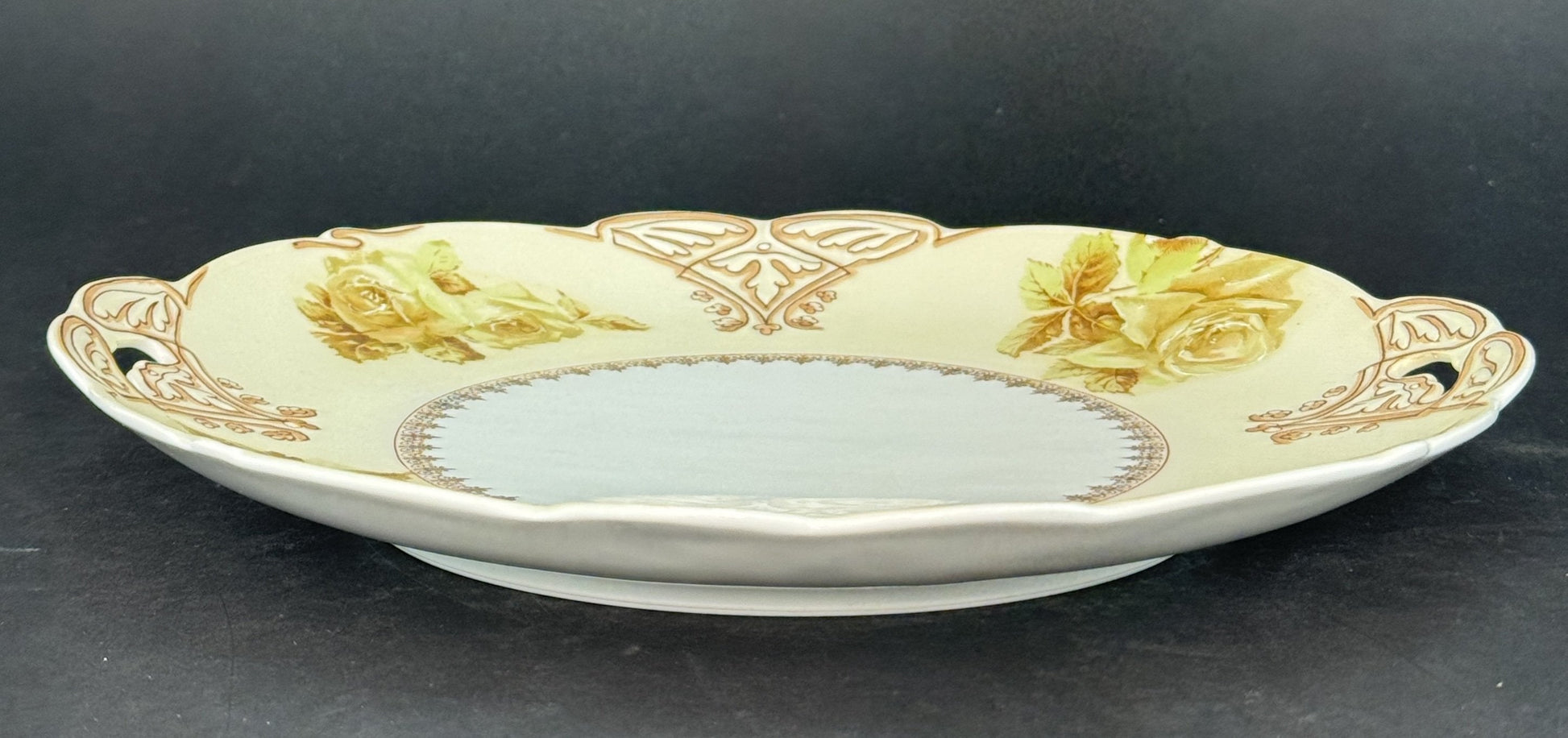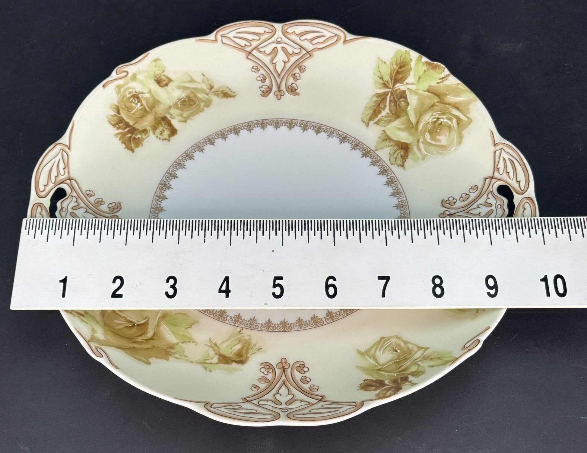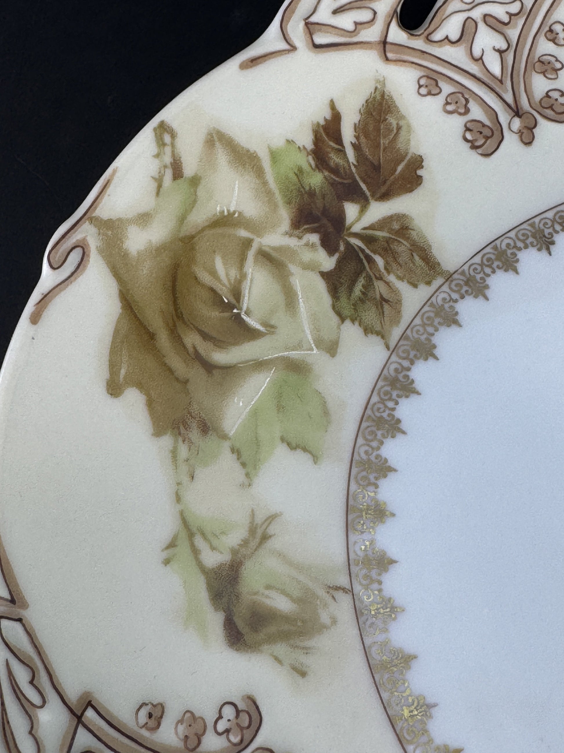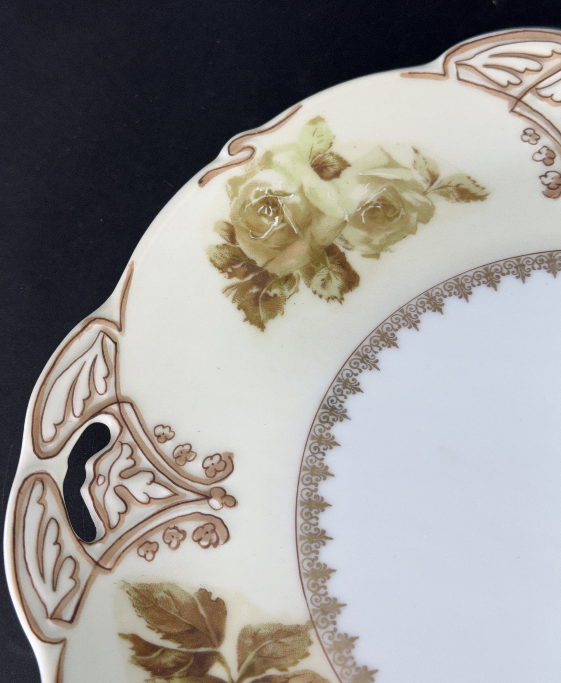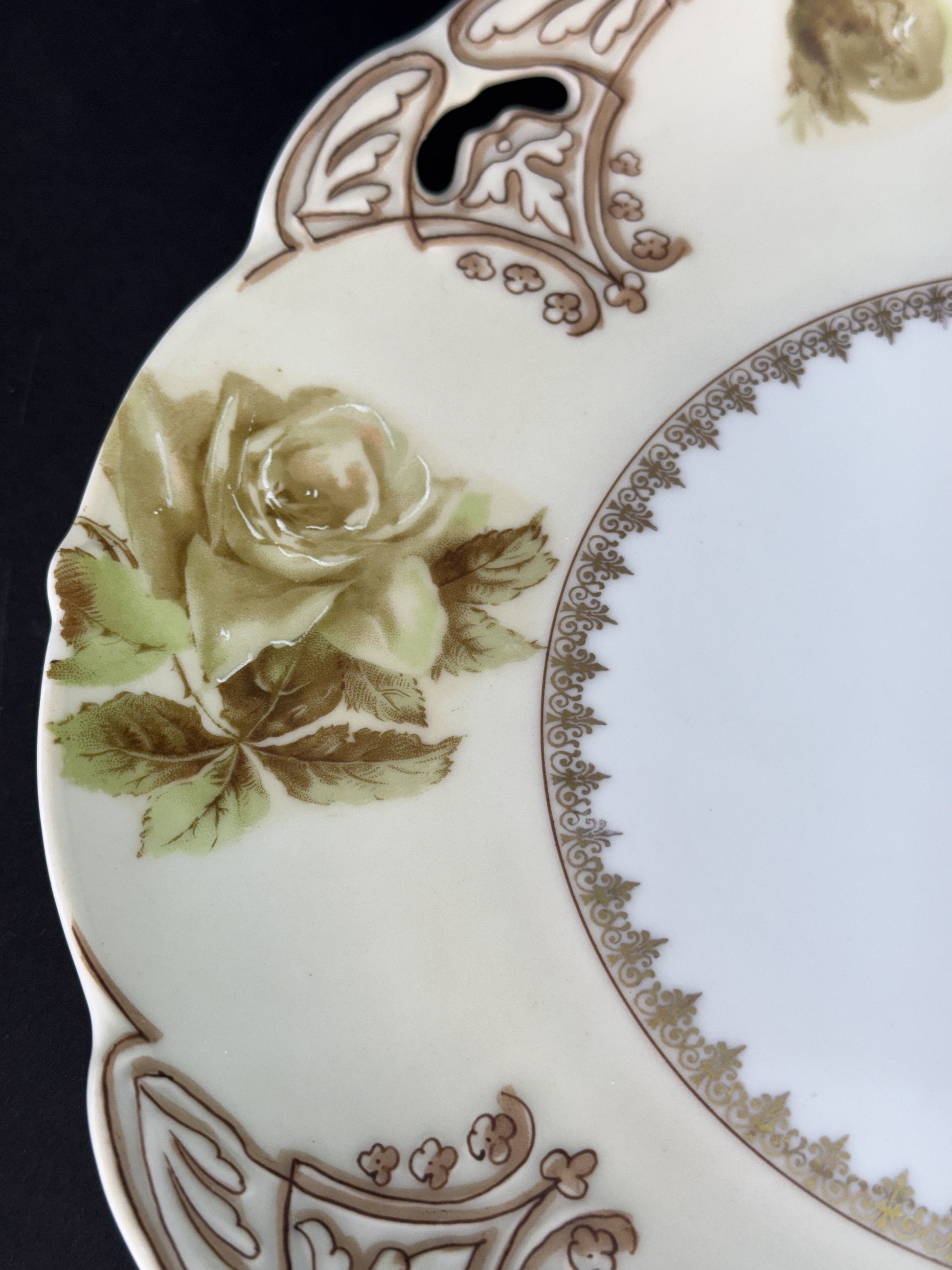 Presented is a fine quality Herman Ohme, Silesia porcelain round serving platter or plate, dating to around the first quarter of the 1900s. This piece is made in the Old Ivory line, and features lovely decoration of roses and leaves against a mellow ivory color background. Please note, we have many additional pieces in this pattern, which you can find by searching “Old Ivory” in our store.