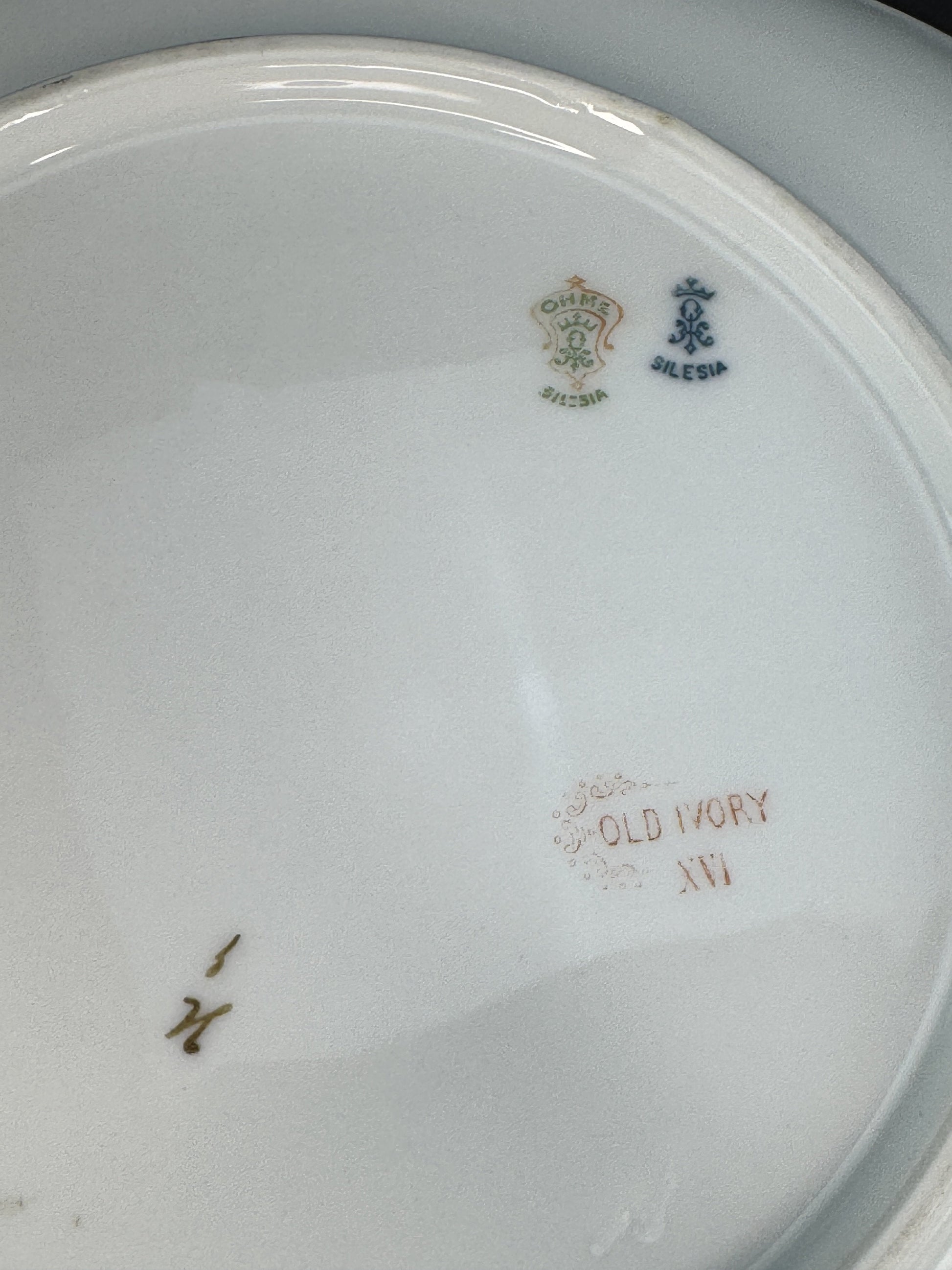 The underside is signed for Hermann Ohme, Silesia Poland, the pattern name, Old Ivory, and XVI (16).