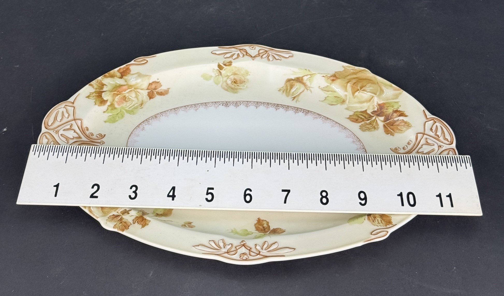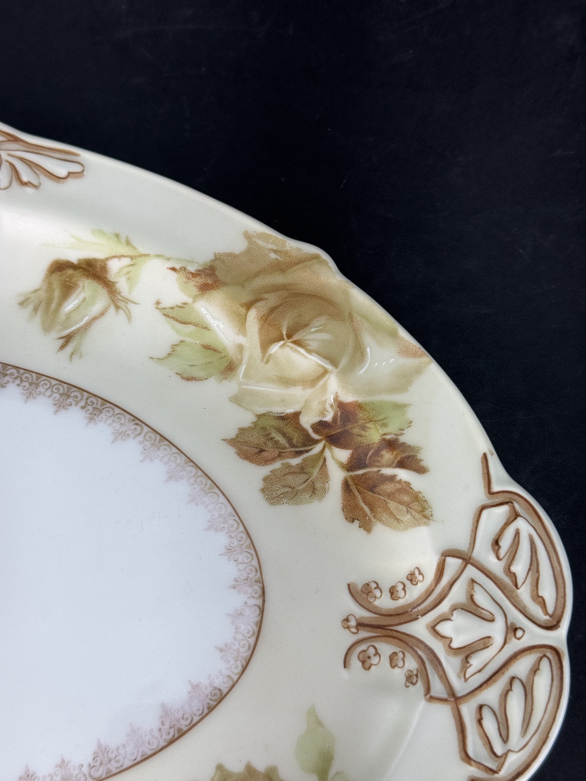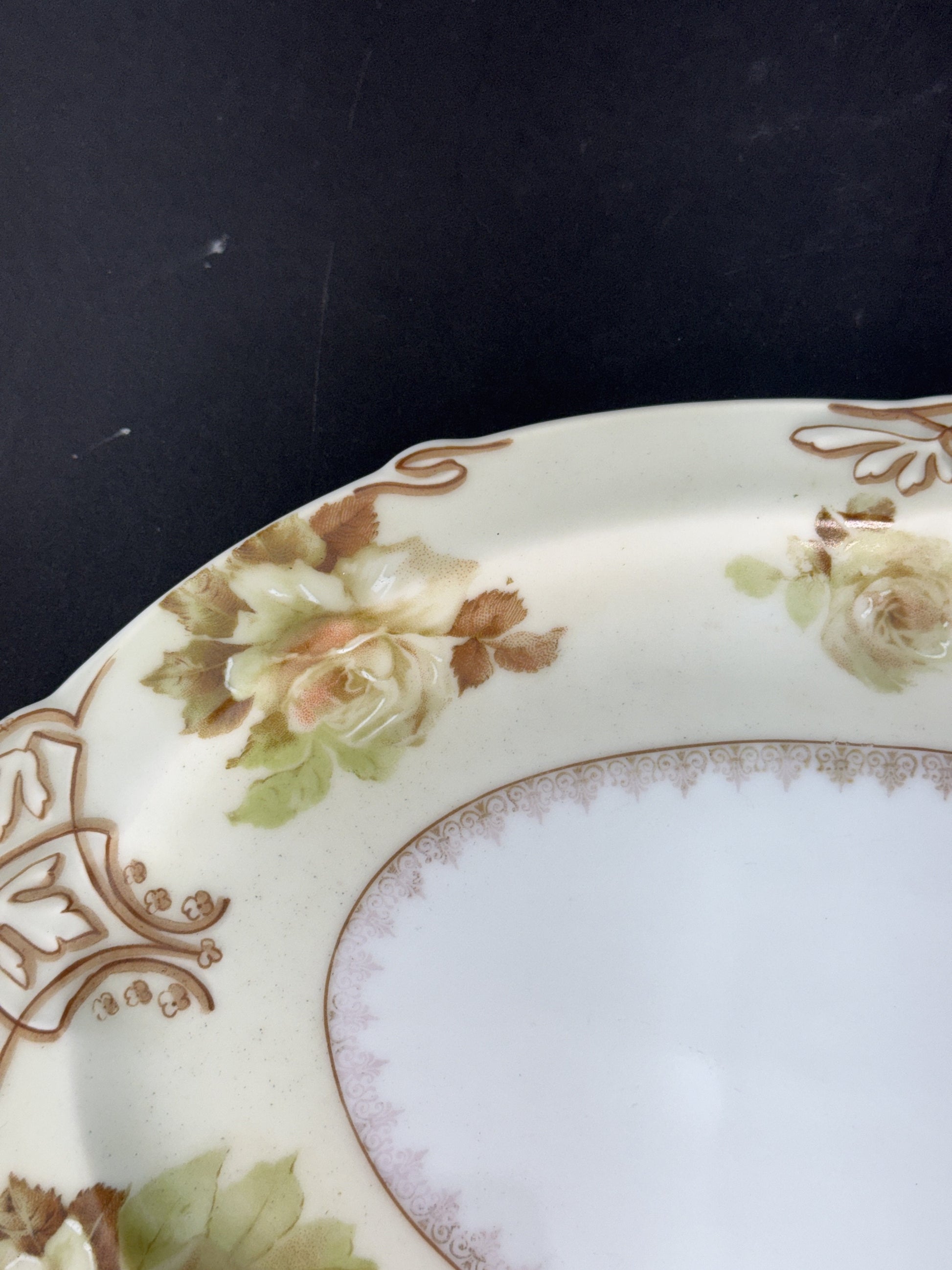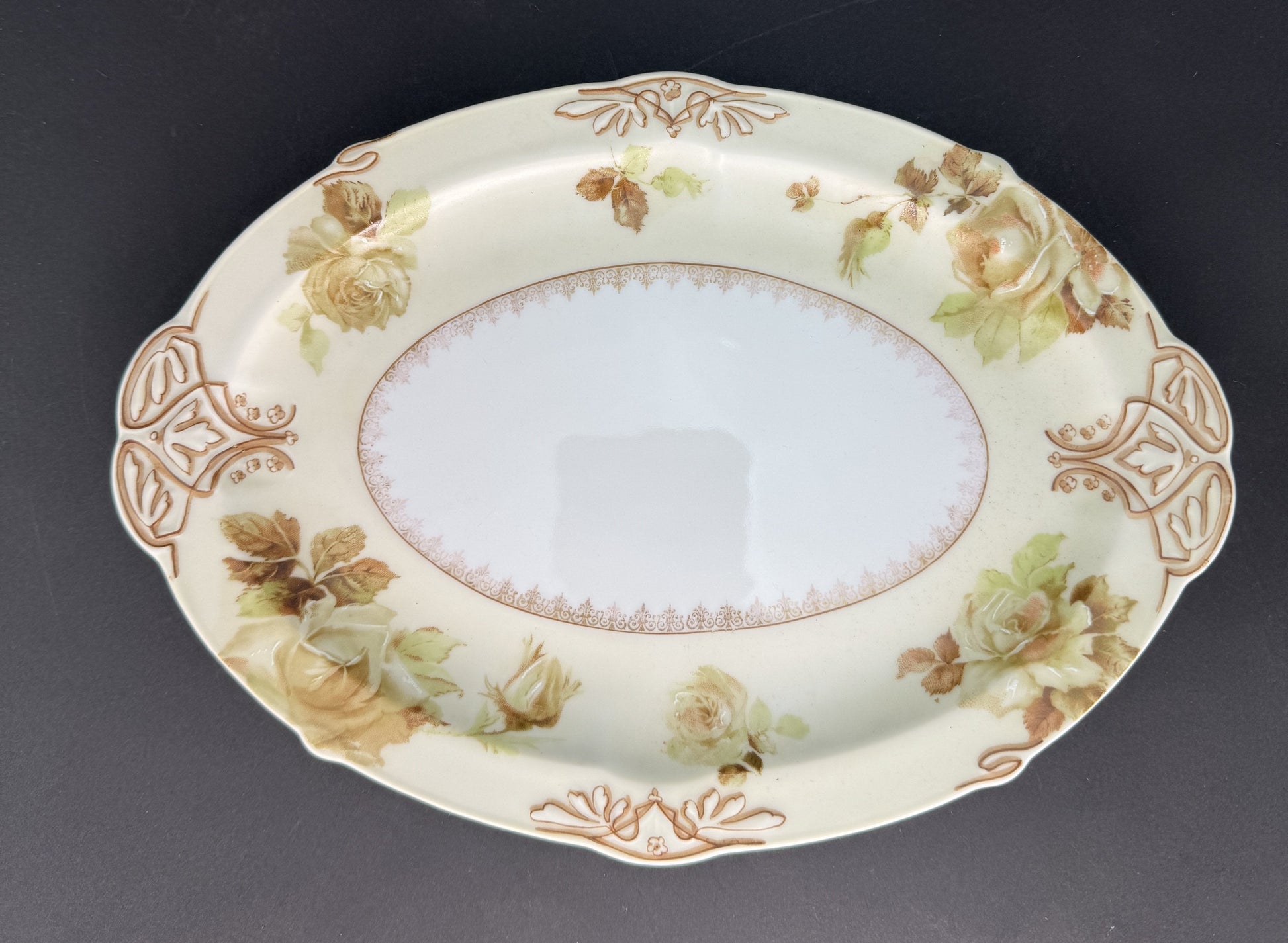 Presented is a fine quality Herman Ohme, Silesia porcelain oval serving platter, dating to around the first quarter of the 1900s. This piece is made in the Old Ivory line, and features lovely decoration of roses and leaves against a mellow ivory color background. Please note, we have many additional pieces in this pattern, which you can find by searching “Old Ivory” in our store.