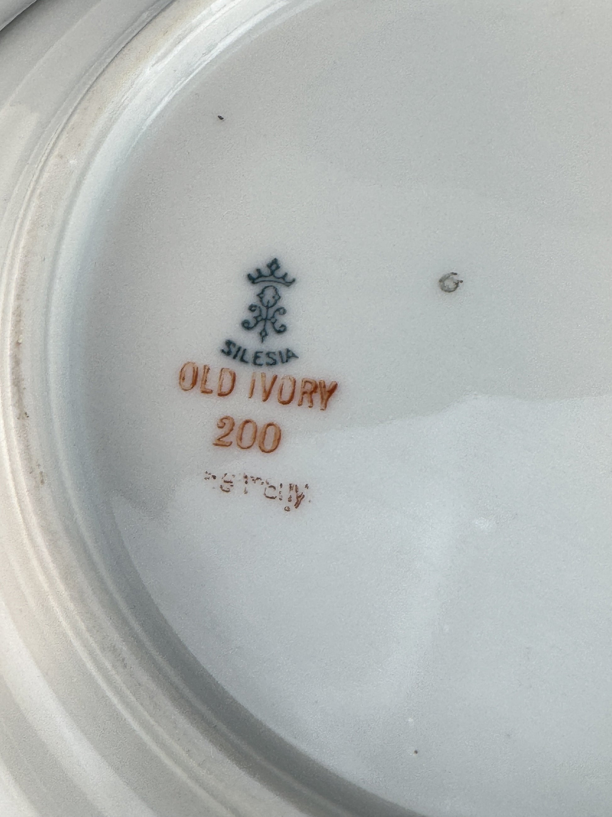 The underside is signed for Hermann Ohme, Silesia Poland, the pattern name Old Ivory, and 200, with another worn mark beneath.