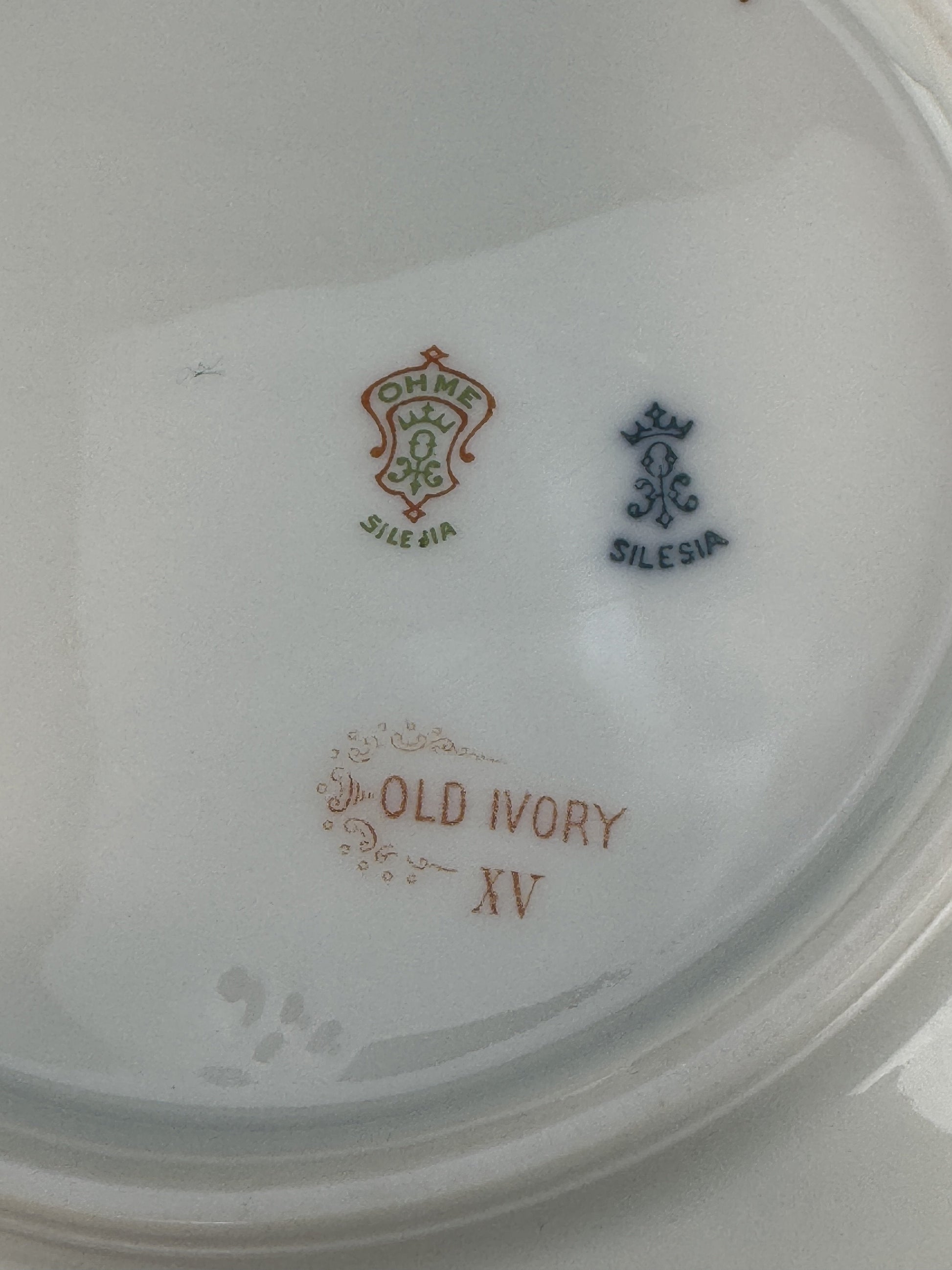 The underside is signed for Hermann Ohme, Silesia Poland, the pattern name Old Ivory, and XV (15)
