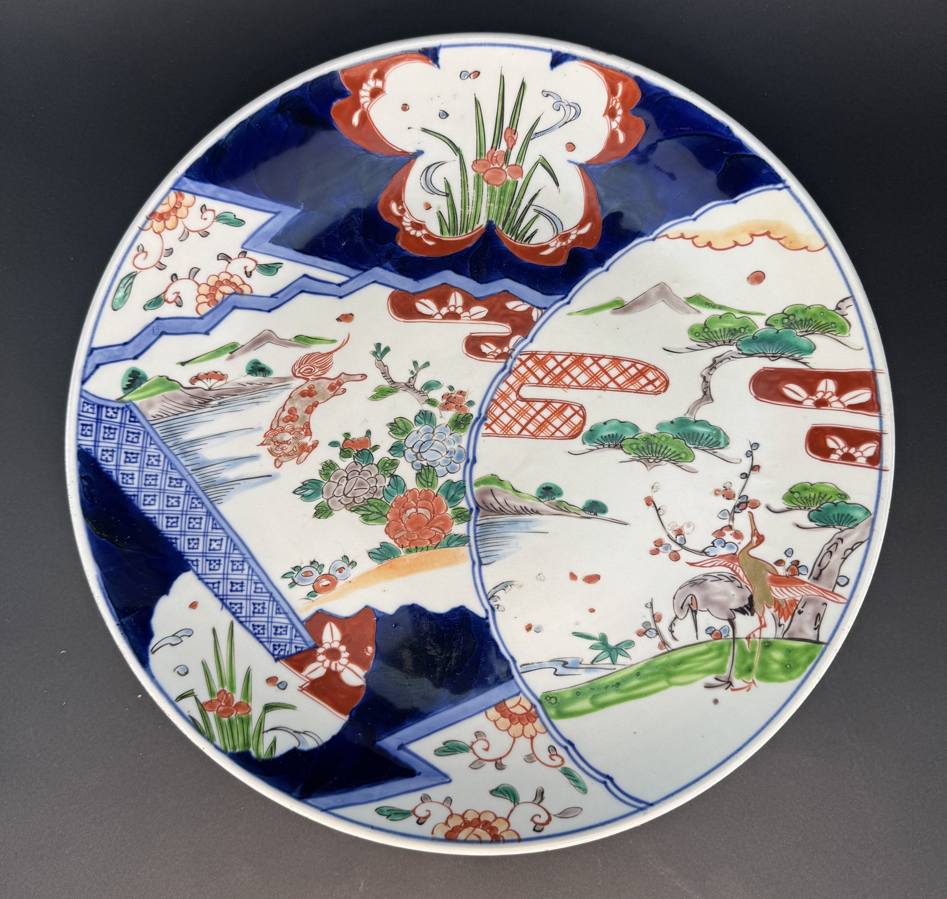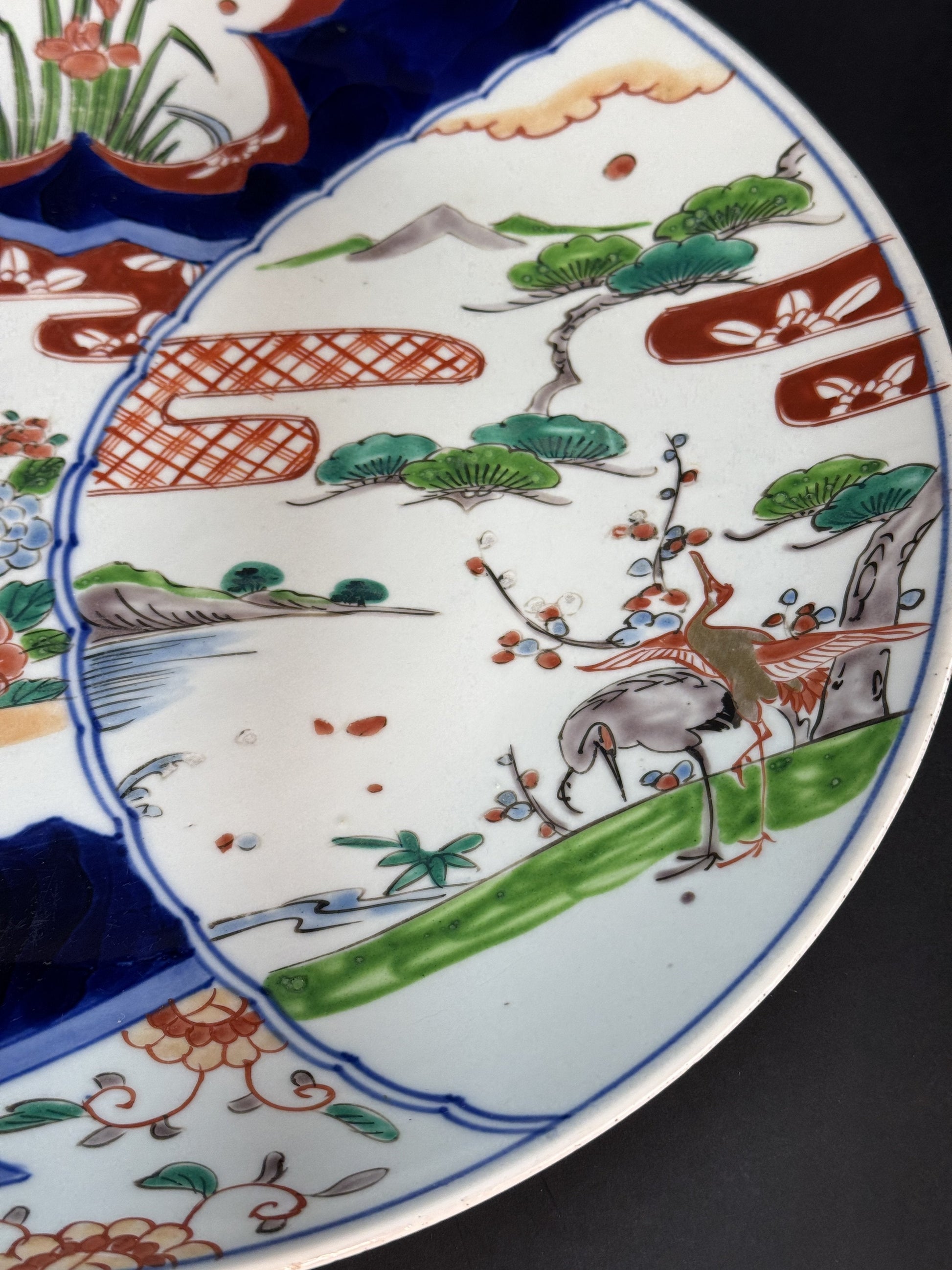 Presented is a wonderful old antique Japanese porcelain charger or large round serving plate. This piece dates to around the mid 1800s. The charger is beautifully decorated in the typical colors of the Imari palette, rust red, cobalt blue, and light green, with gold gilt detailing. The dish features lavish decoration in the form of a lion and peonies, a pair of cranes, and various trees and plants with mountains in the background.