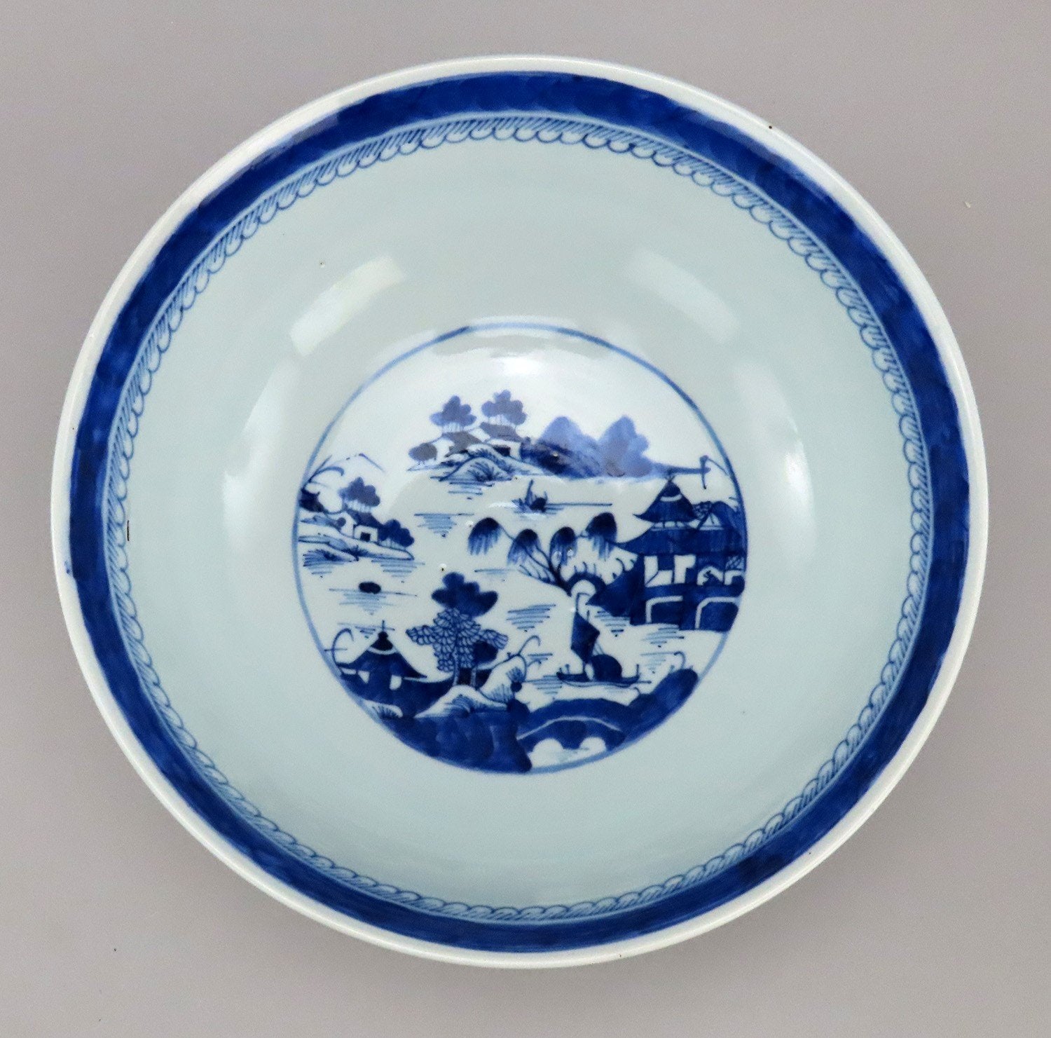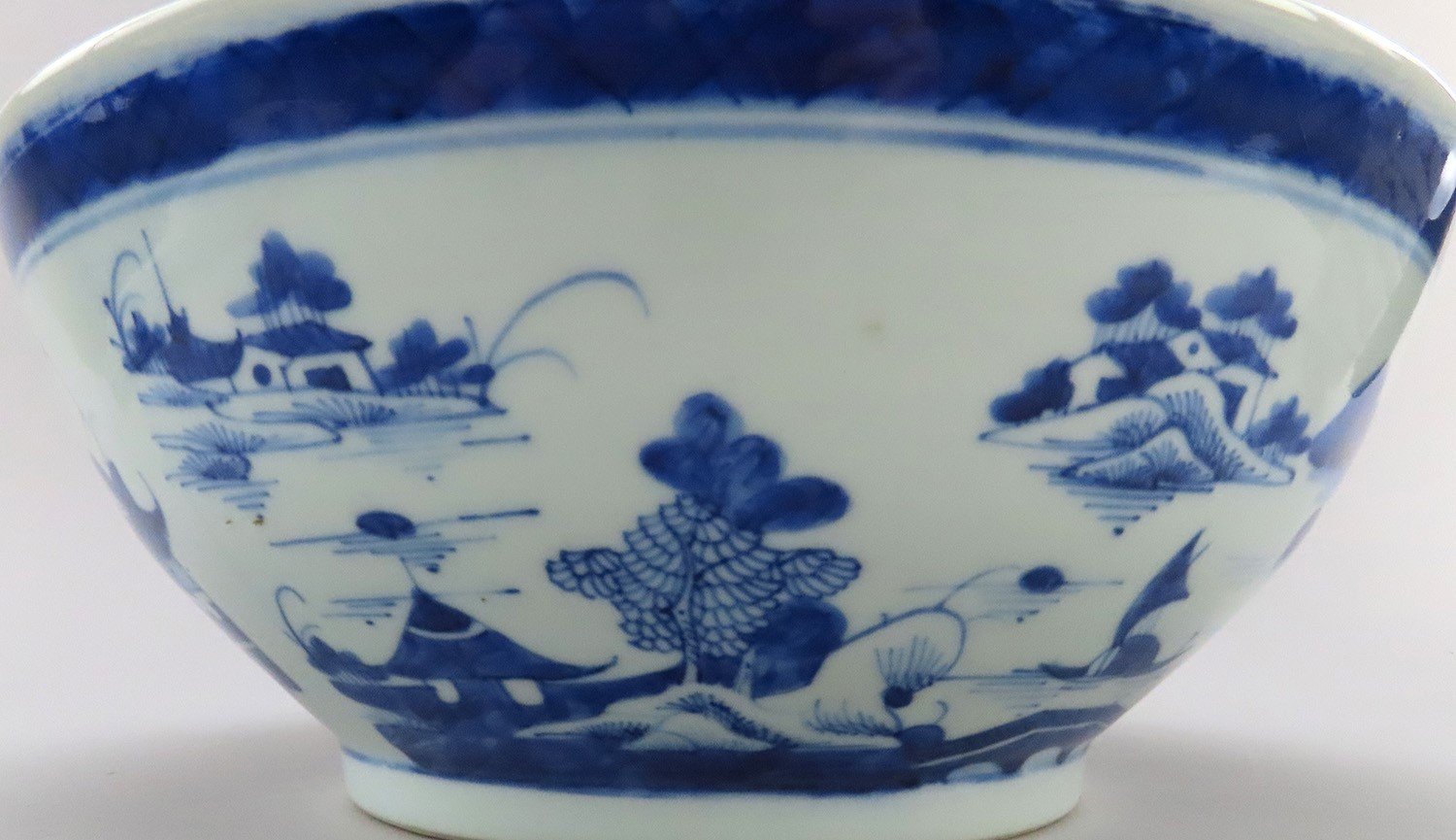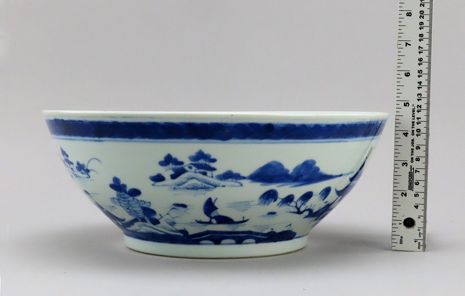 Presented is a large classical Chinese Canton porcelain centerpiece bowl made in the late 1800s-early 1900s. This piece displays a beautiful Chinese landscape scene at the center of the bowl and around the exterior. There is a thick cobalt blue border around both sides of the rim.