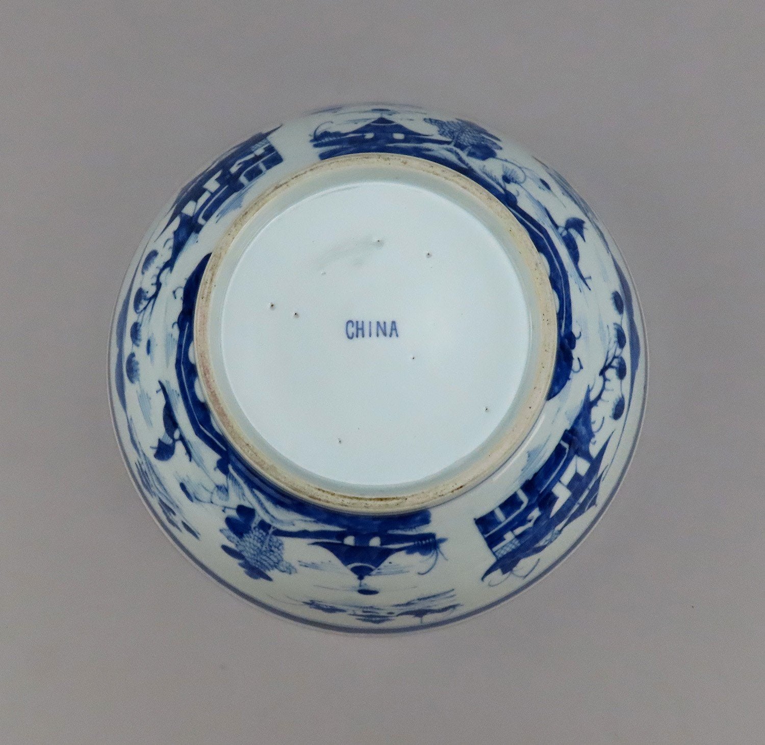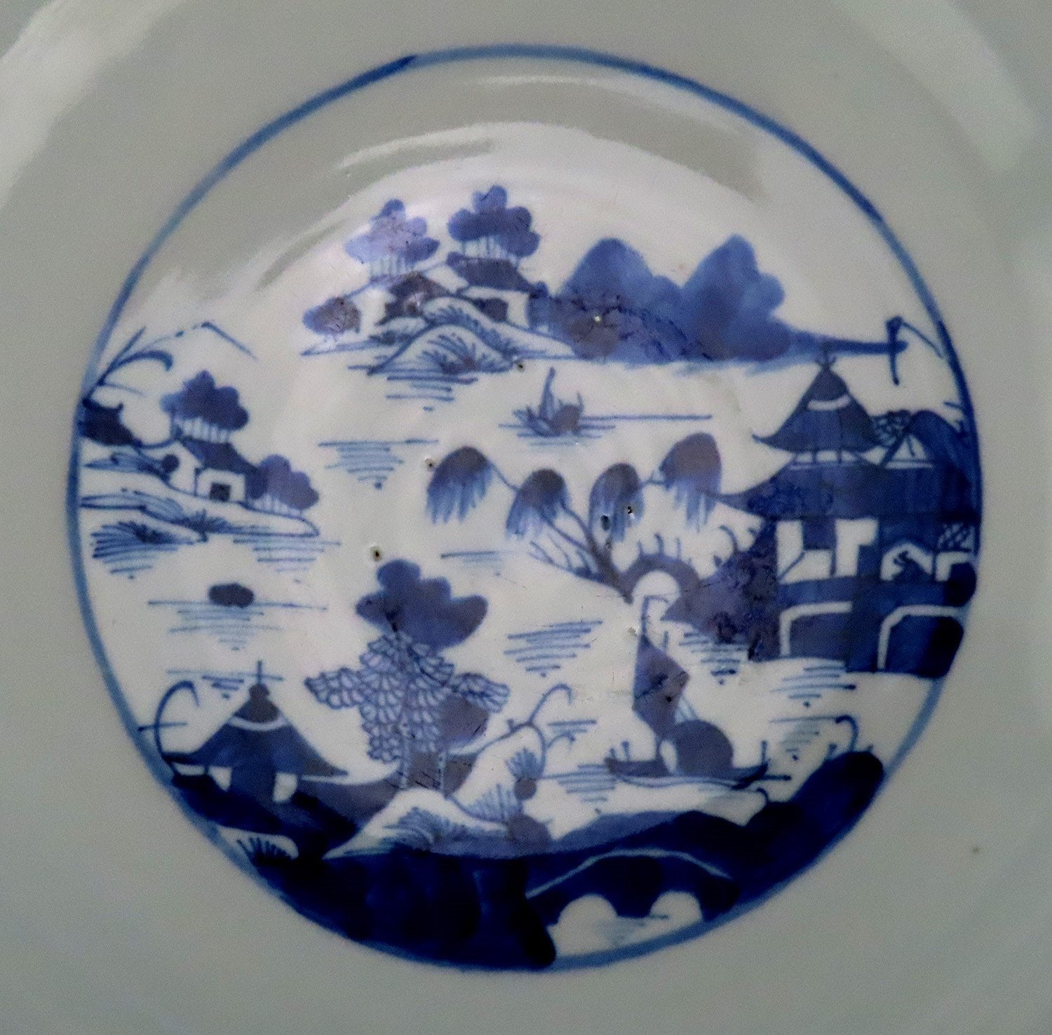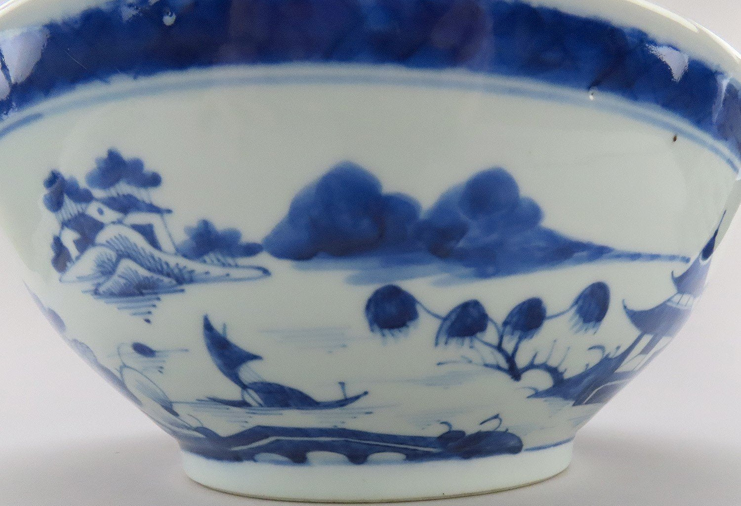 Presented is a large classical Chinese Canton porcelain centerpiece bowl made in the late 1800s-early 1900s. This piece displays a beautiful Chinese landscape scene at the center of the bowl and around the exterior. There is a thick cobalt blue border around both sides of the rim.