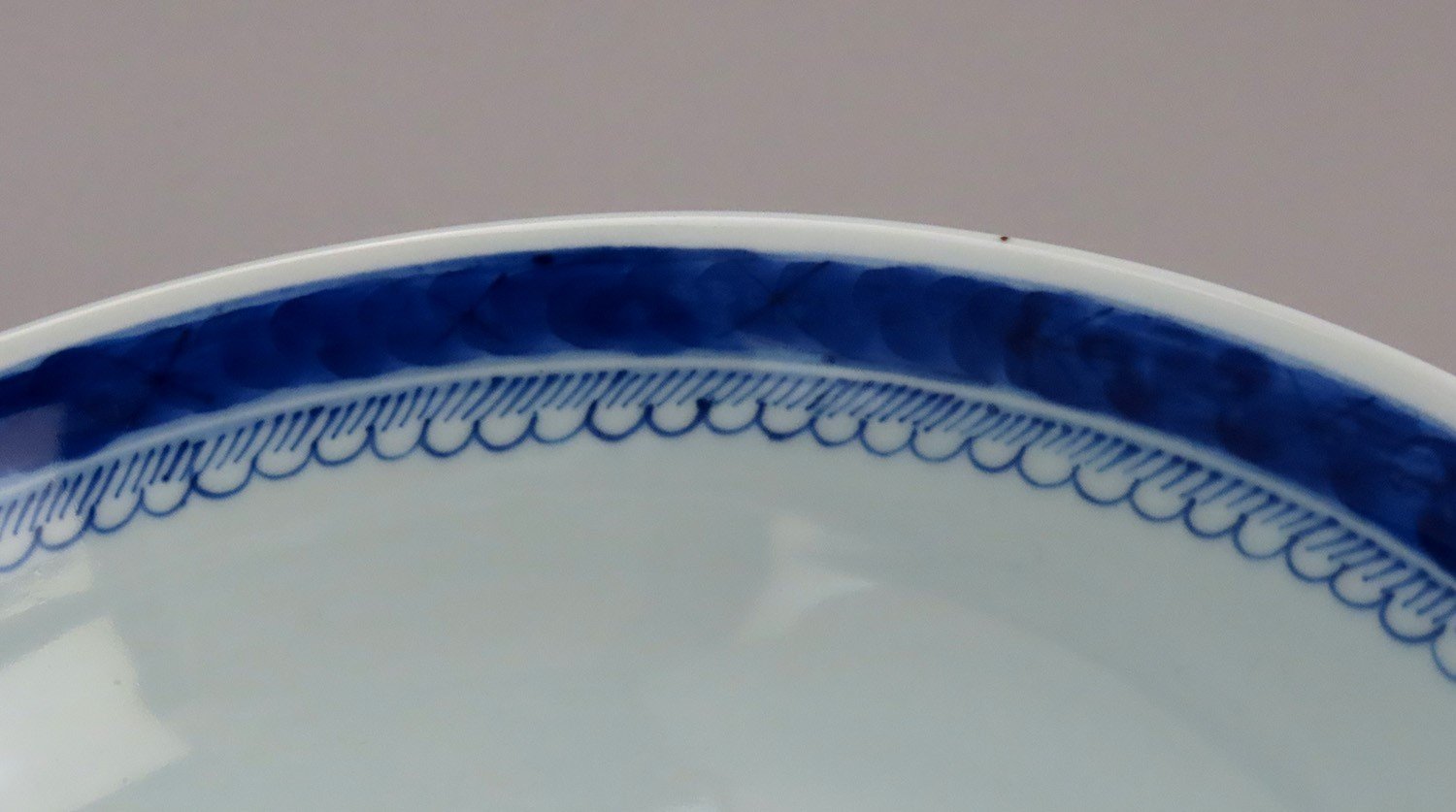This piece is in great overall condition. There is a small skip in the glaze on the interior under the border decorations that is not wear but something that was made in the original making of the piece. There are no cracks, no breaks, and no repairs.