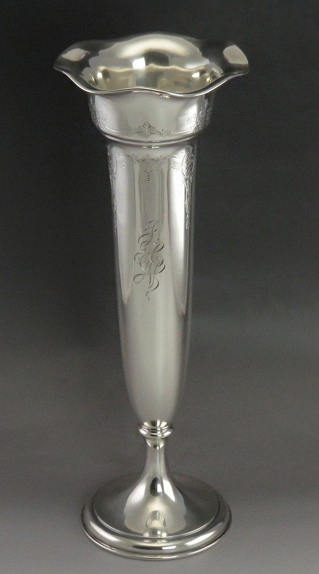 Antique Large Sterling Silver International Hand Engraved Trumpet Vase