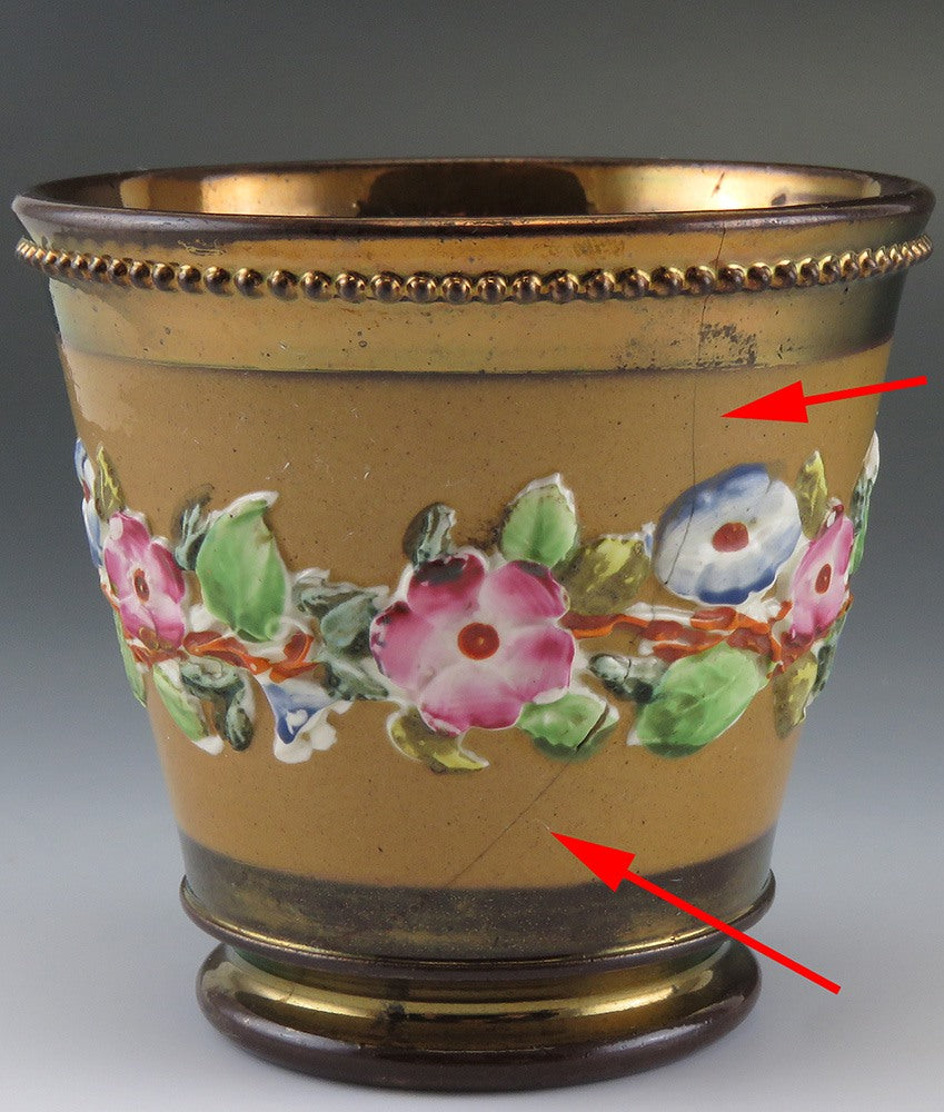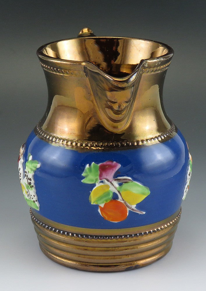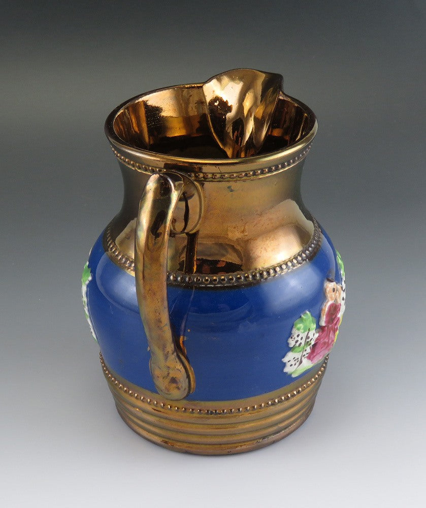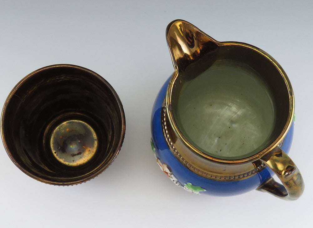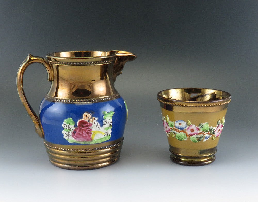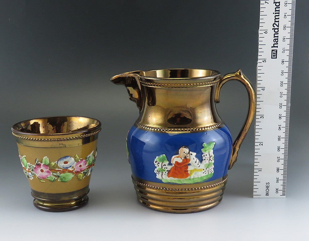 Antique Mid 1800s Staffordshire English Copper Luster Ware Pottery Pitcher & Cup