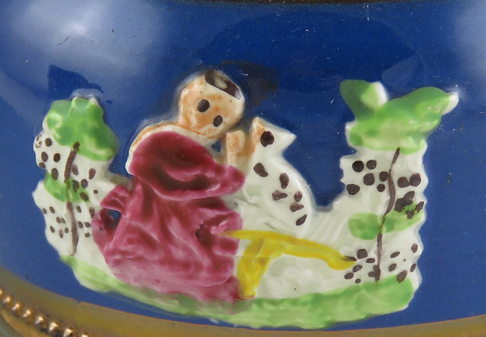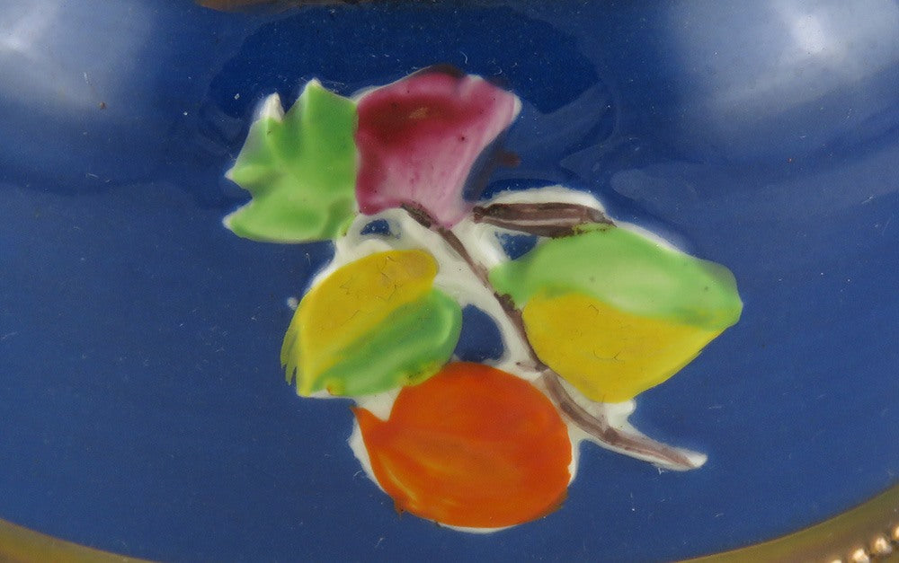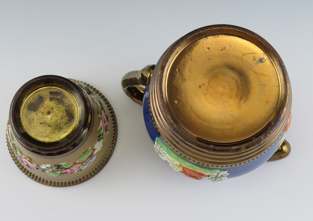 This set is in good overall condition considering the age of the pieces. The cup has a hairline crack and some tiny flakes to the raised floral decorations. The pitcher has some tiny flakes to the paint of the raised portions.