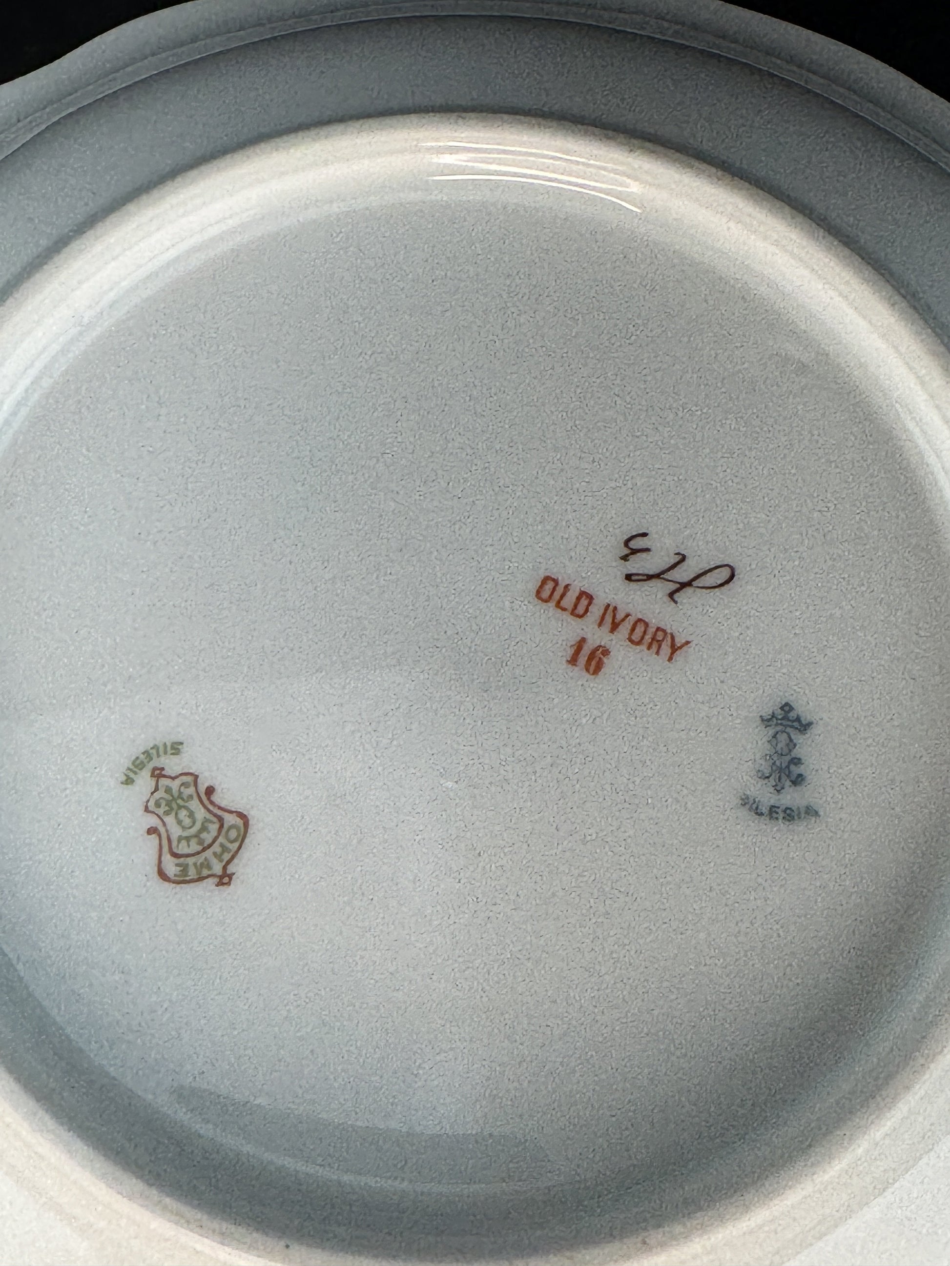 The underside is signed for Hermann Ohme, Silesia Poland, the pattern name Old Ivory, and 16.