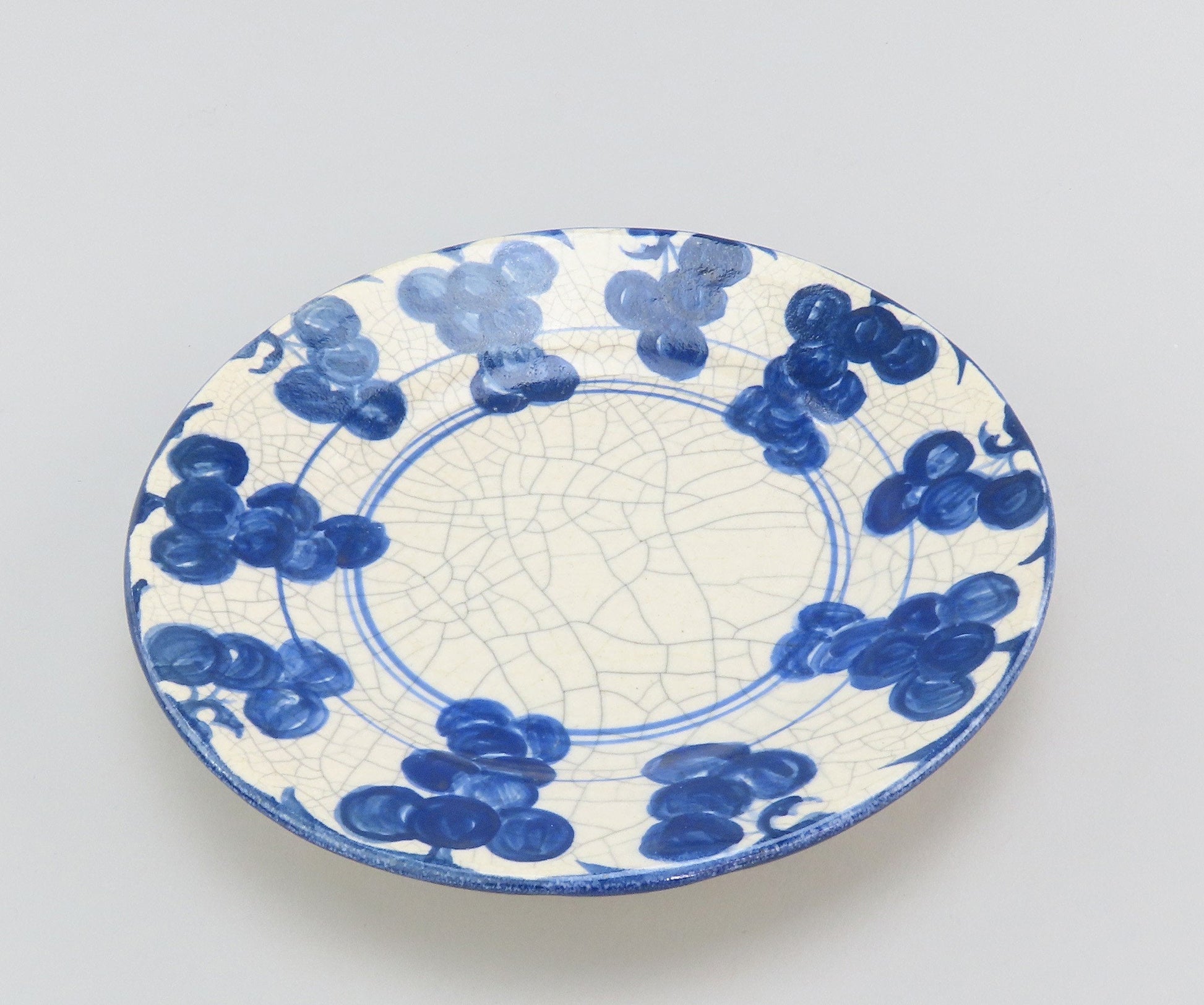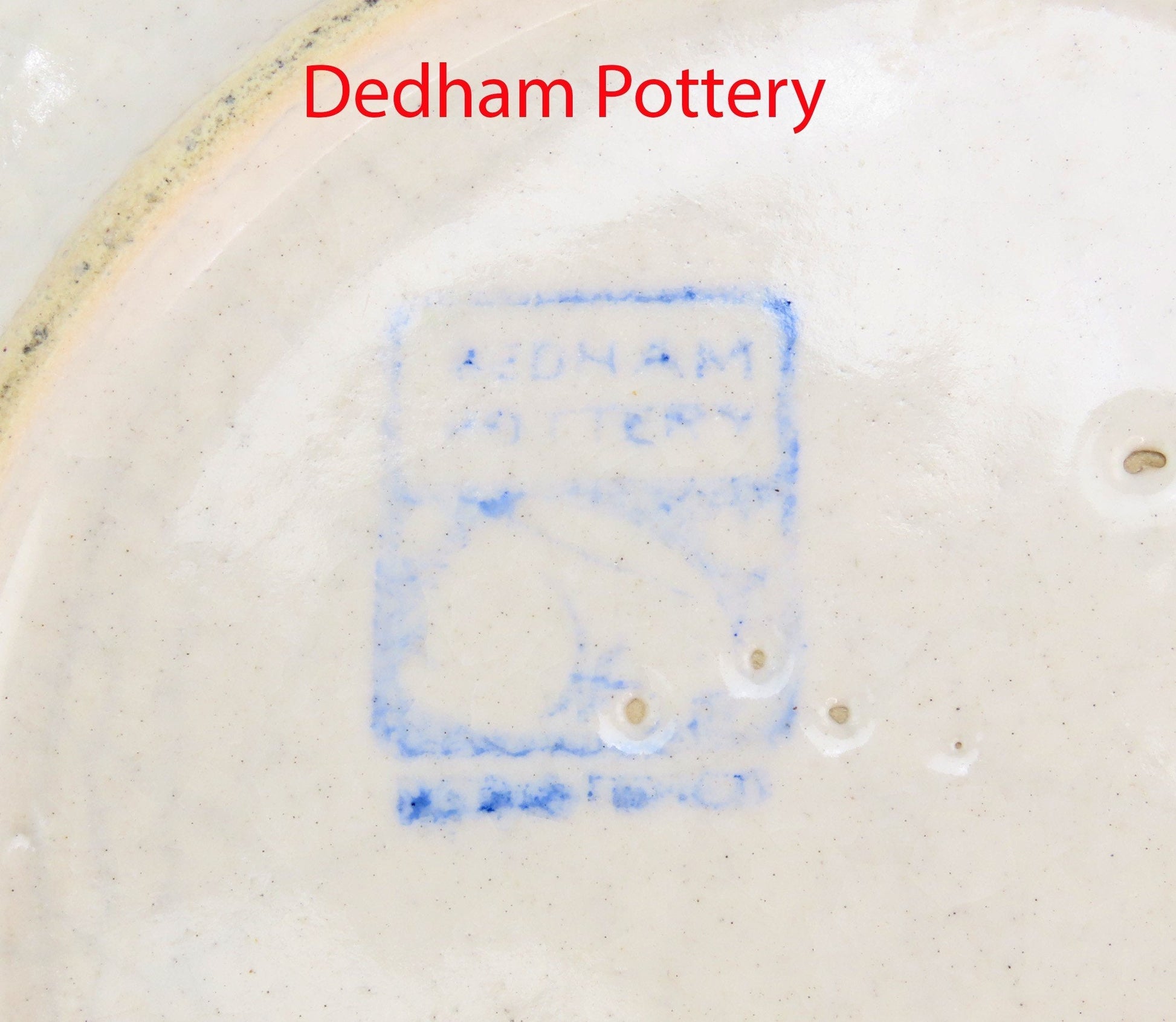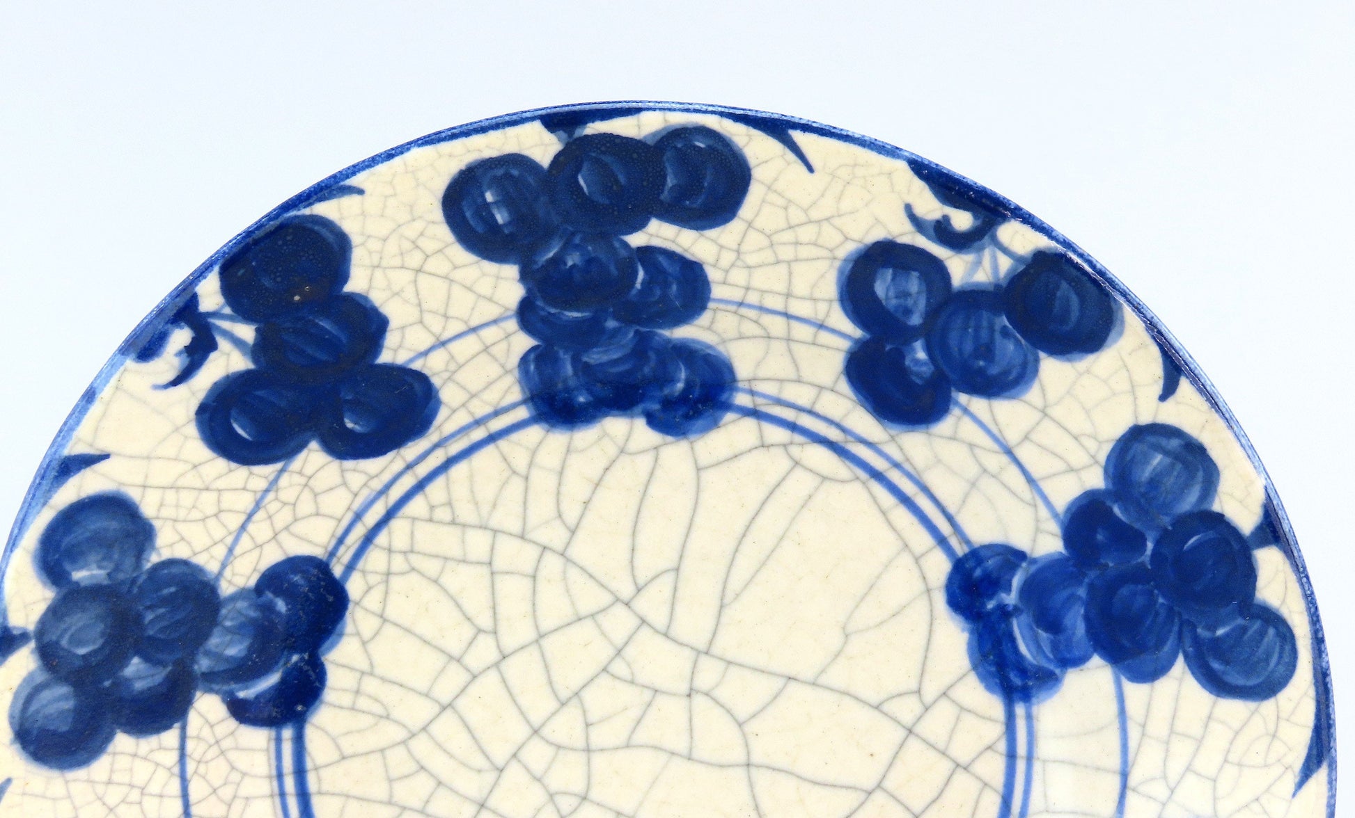 Presented is a fine old Dedham pottery bread plate, in the grape pattern. This pattern, as the name suggests, features a charming border made up of grape clusters in rich cobalt blue, against the classic Dedham off white crackle glaze. This is a real antique Dedham piece dating to around the 1920s-1930s, not a modern reproduction by the Potting Shed/Pottery Shed.