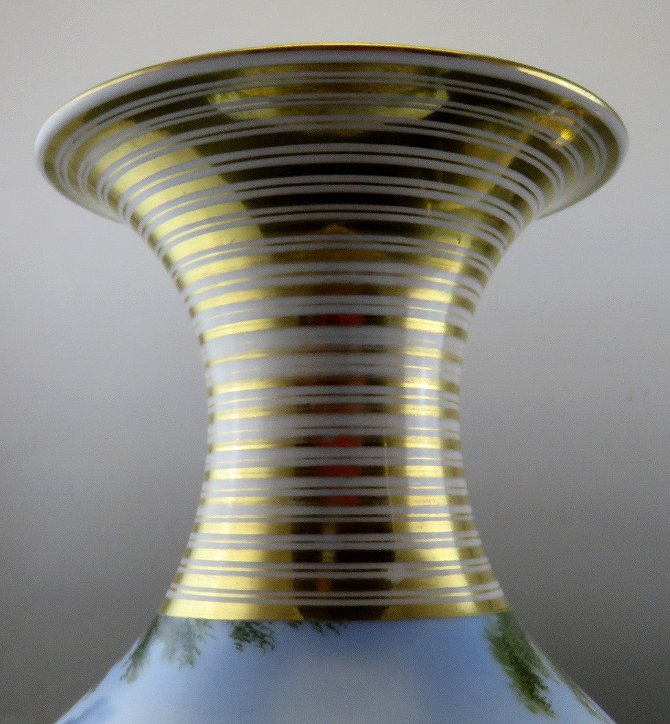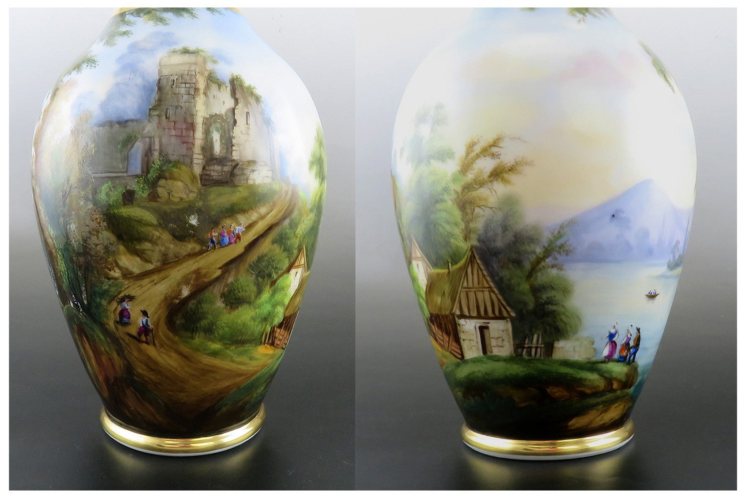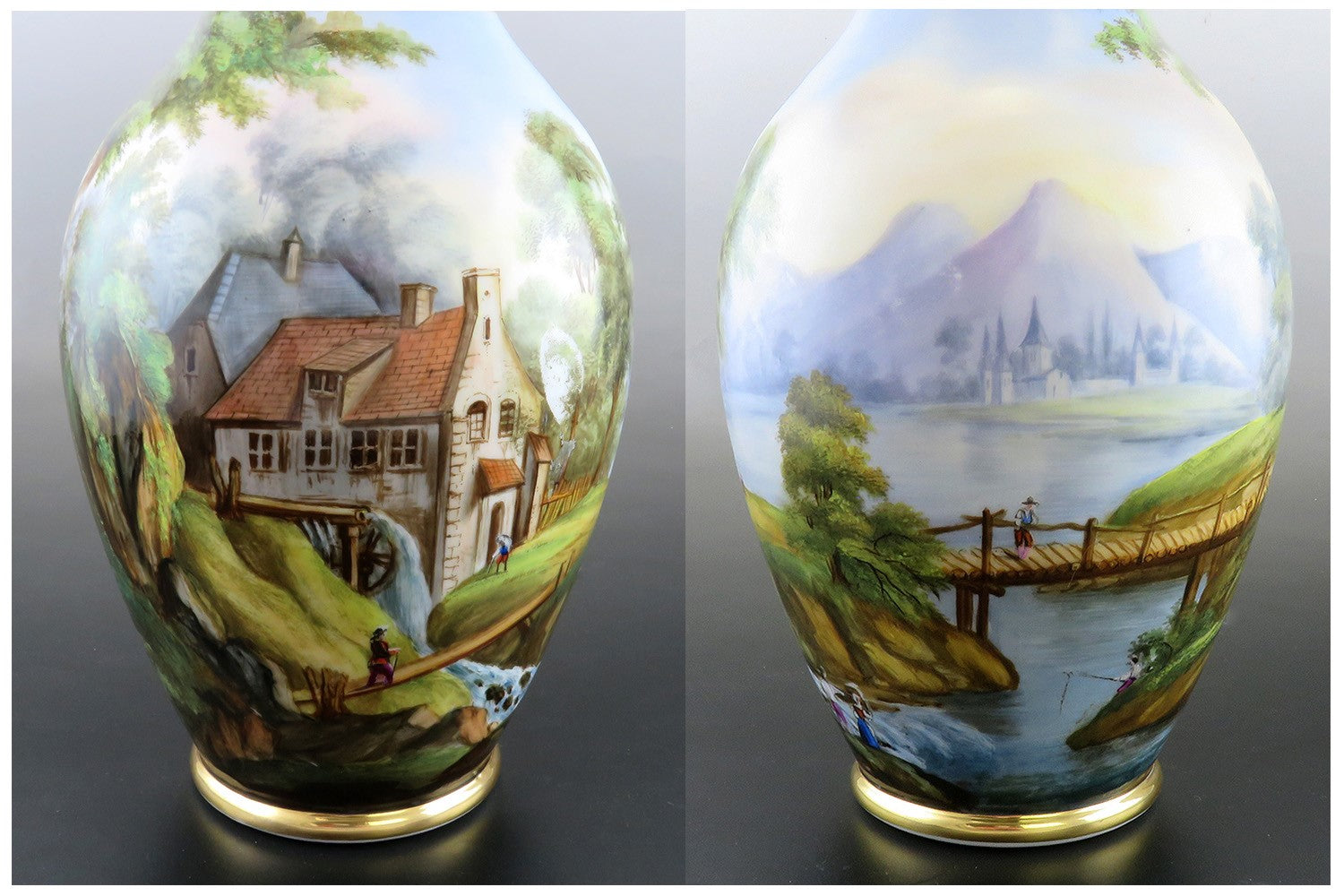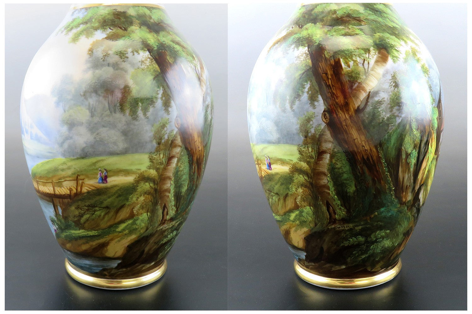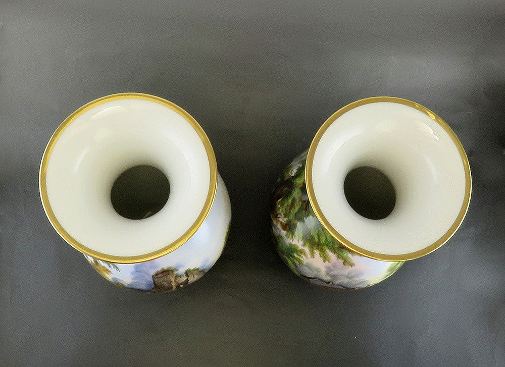 The vases are in great condition with no damages and no repairs. There is some slight wear to the gold bands of design along the top portions and there appears to be some loss of paint, or some small repainted section to one of the painted scenes, but it is overly a portion that is only trees and bushes, so it is not very noticeable unless you are really inspecting the piece.