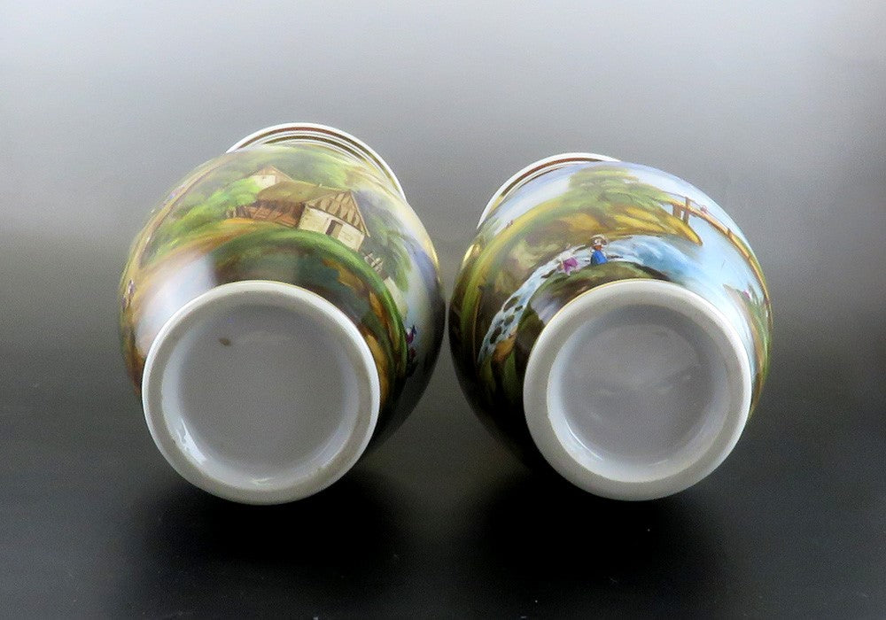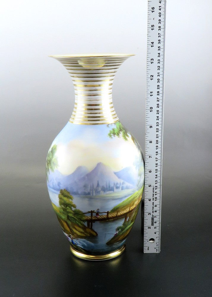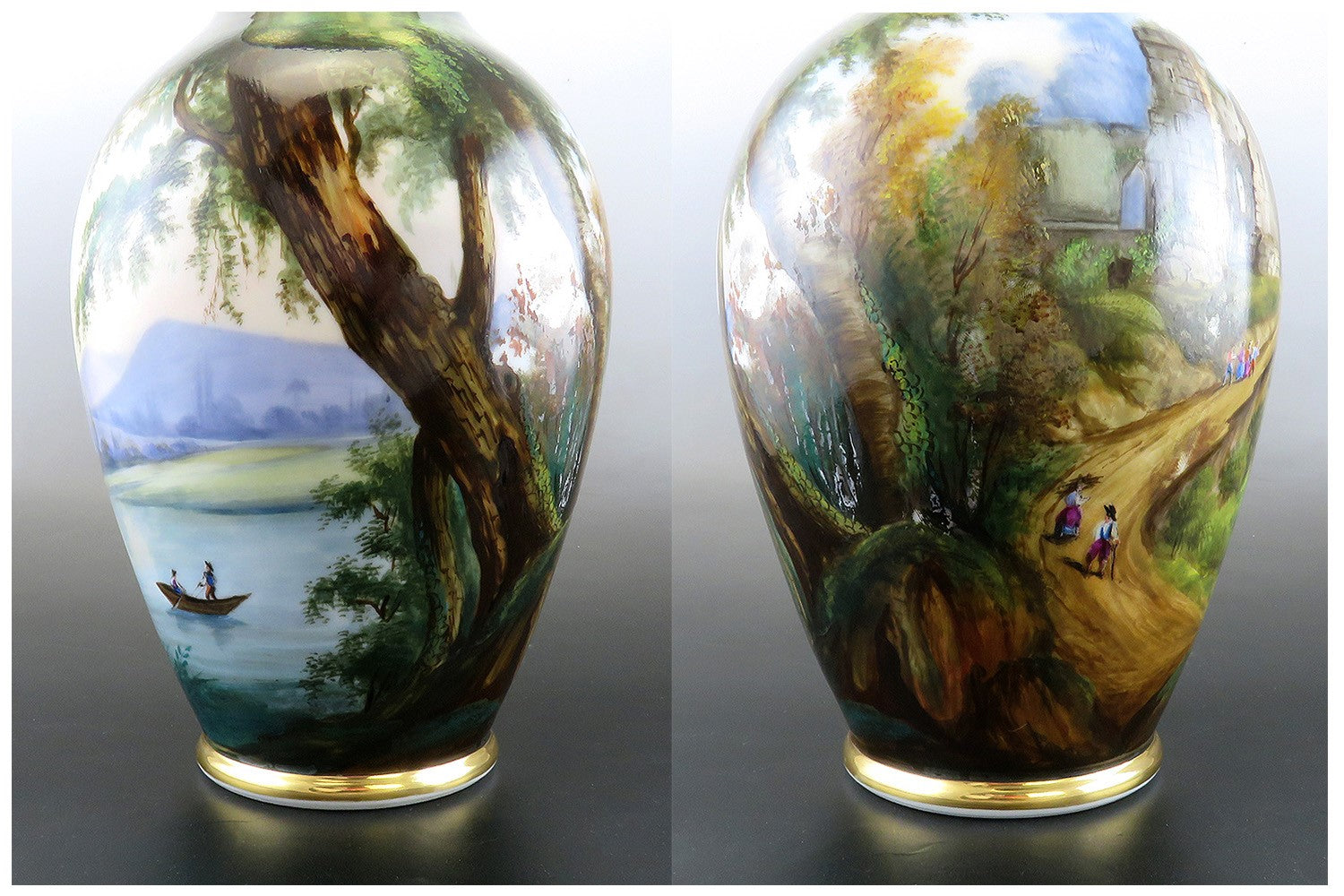 Antique Pair Hand Painted Porcelain Landscape Scene Large Flower Vases 13 1/2"