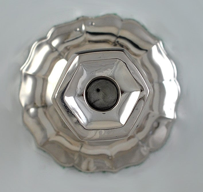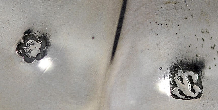 The candlesticks are marked on the base and shaft with the Austrian Diana mark in a 5-lobed punch for 800 silver purity. The bases are also marked with the initials SC for the maker. We have tested the pair with nitric acid and guarantee them to be 800 purity silver.
