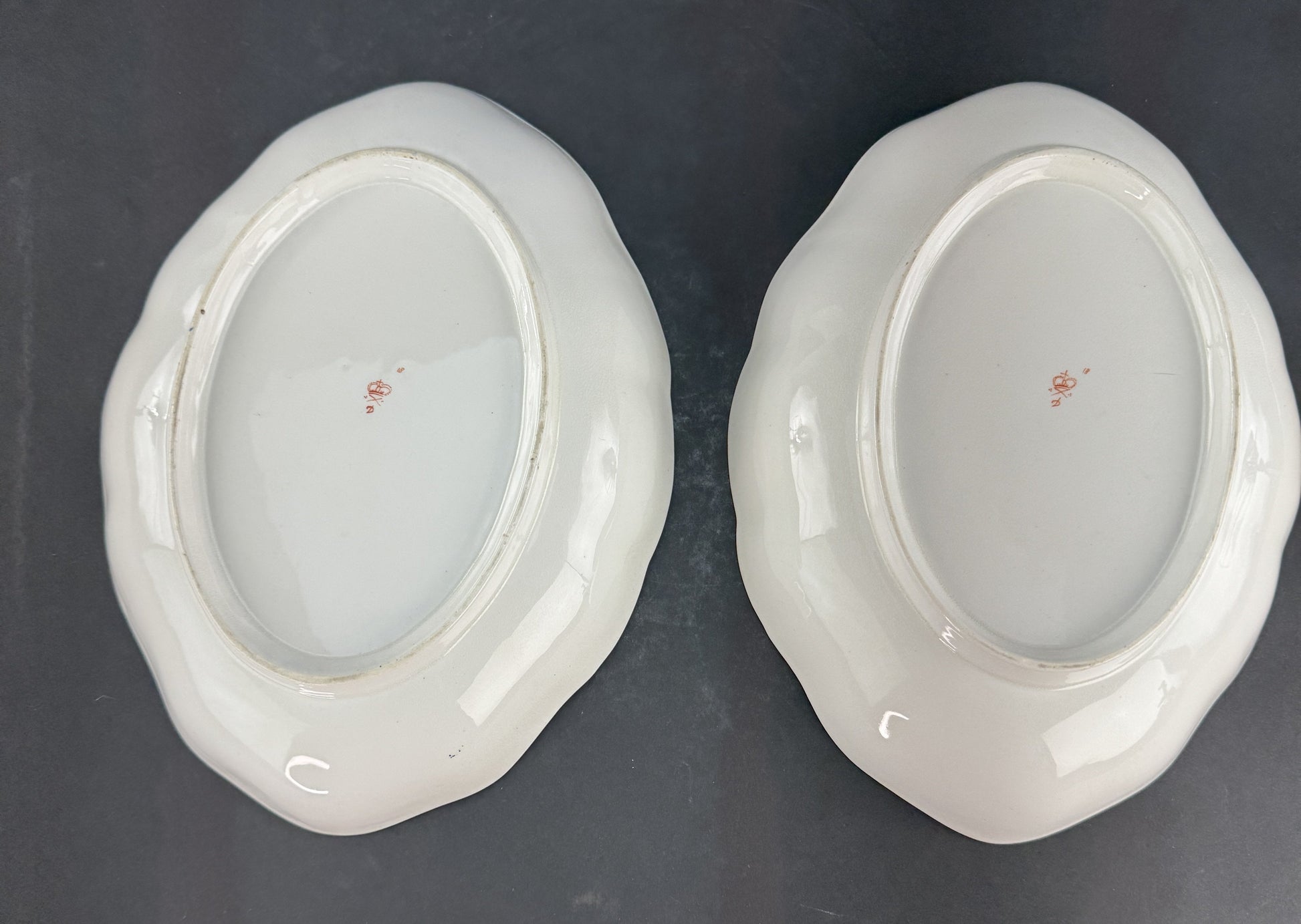 Presented as a very pretty pair of old English serving bowls. There is a beautiful wide cobalt and gilded declaration along the edge. Both pieces are marked on the back for the English company Derby. This is one of their older marks and was used in the early 1800s, circa 1820s.