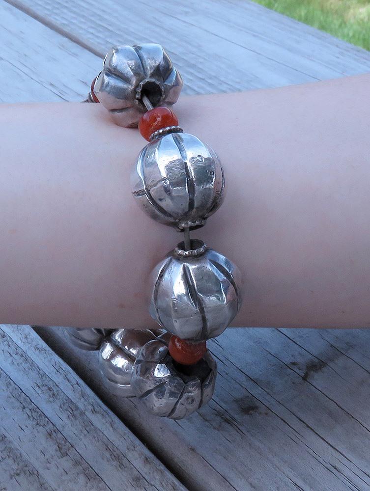The condition of the bracelet is pretty good. The beads and wire seem indestructible. One bead is missing a little silver on one end, showing the wood beneath it. The beads show wear, and it appears that three beads are missing.