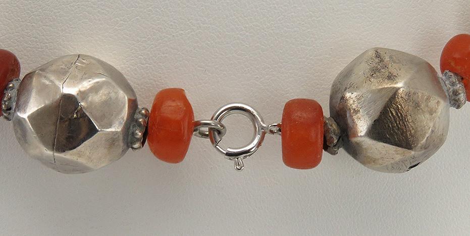The condition of the necklace is pretty good. The necklace still shows well will its flaws turned inside. There are five dented silver balls and a couple with hairline cracks at the seams, still holding strongly. The amber beads are in good shape, with only two, the final beads at the clasp, having small chips. The spring loop clasp is modern, added after the original, and is in perfect shape.