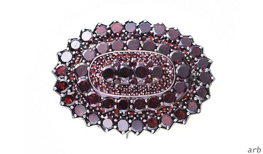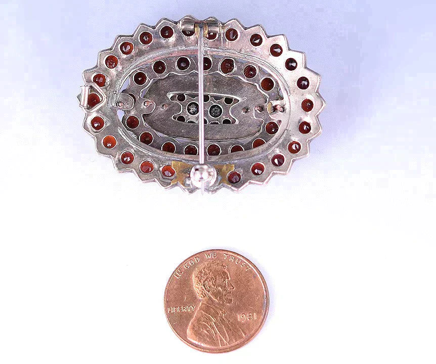 Antique Silvery Oval-Shaped Pin Set w/ 3 Tiers of Red Garnets, from Austria?