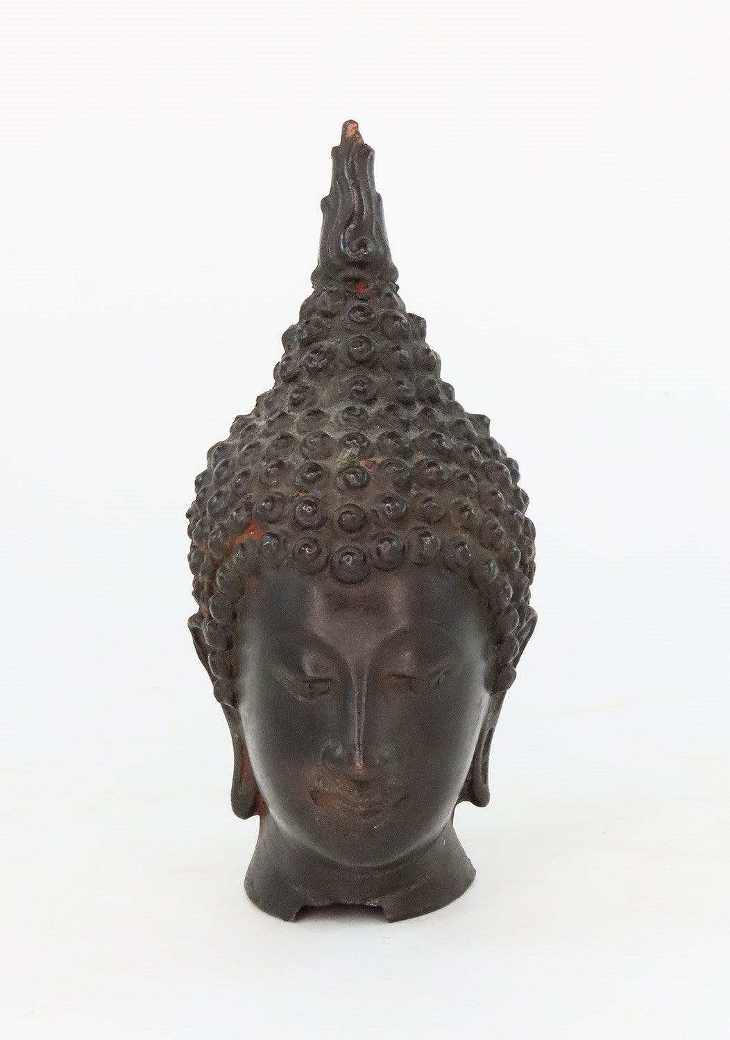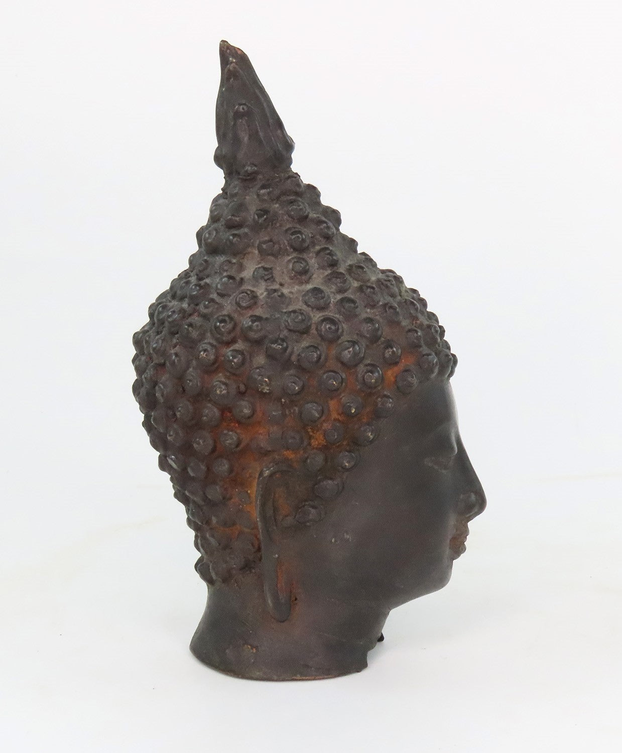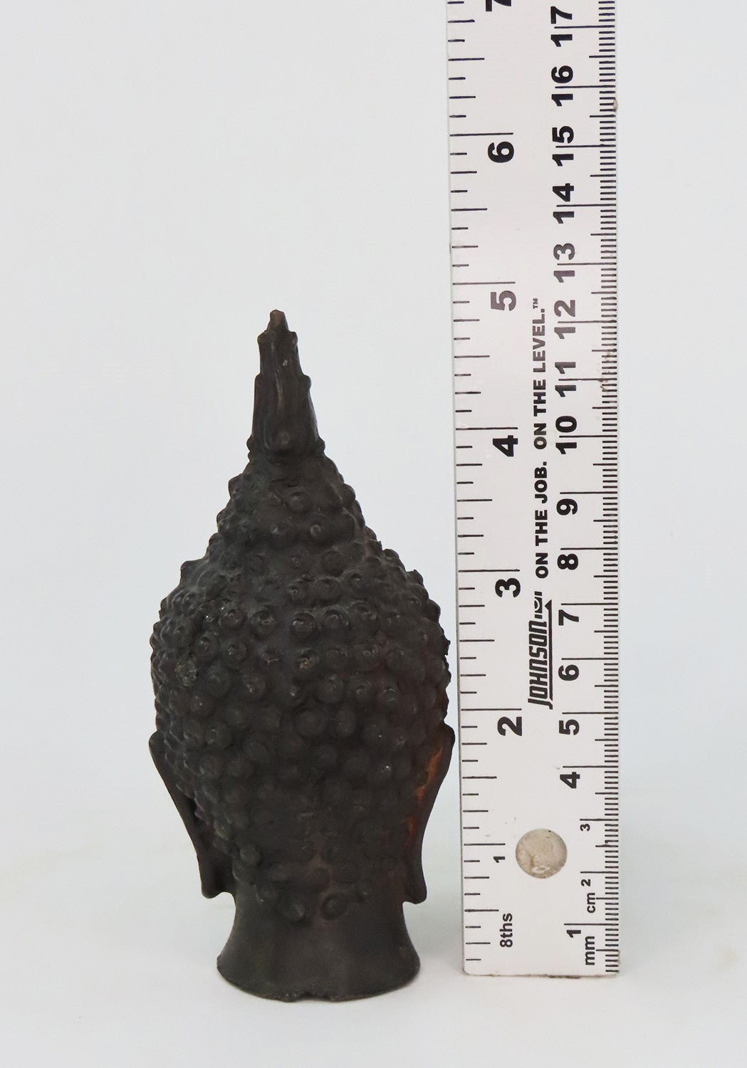 Presented is a wonderful antique cast metal Buddha head figurine. This piece dates to the 1800s, and is possibly of Thai origin, but it is hard to date this piece more specifically. The figurine is finely cast in dark metal, either cast iron or bronze. The depiction is austere and traditional, with downcast gaze, elongated earlobes, and high, flame form ushnisha at the top. This piece likely had a base originally, and there is still some solder visible around the interior of the neck, but the figurine stands on its own.