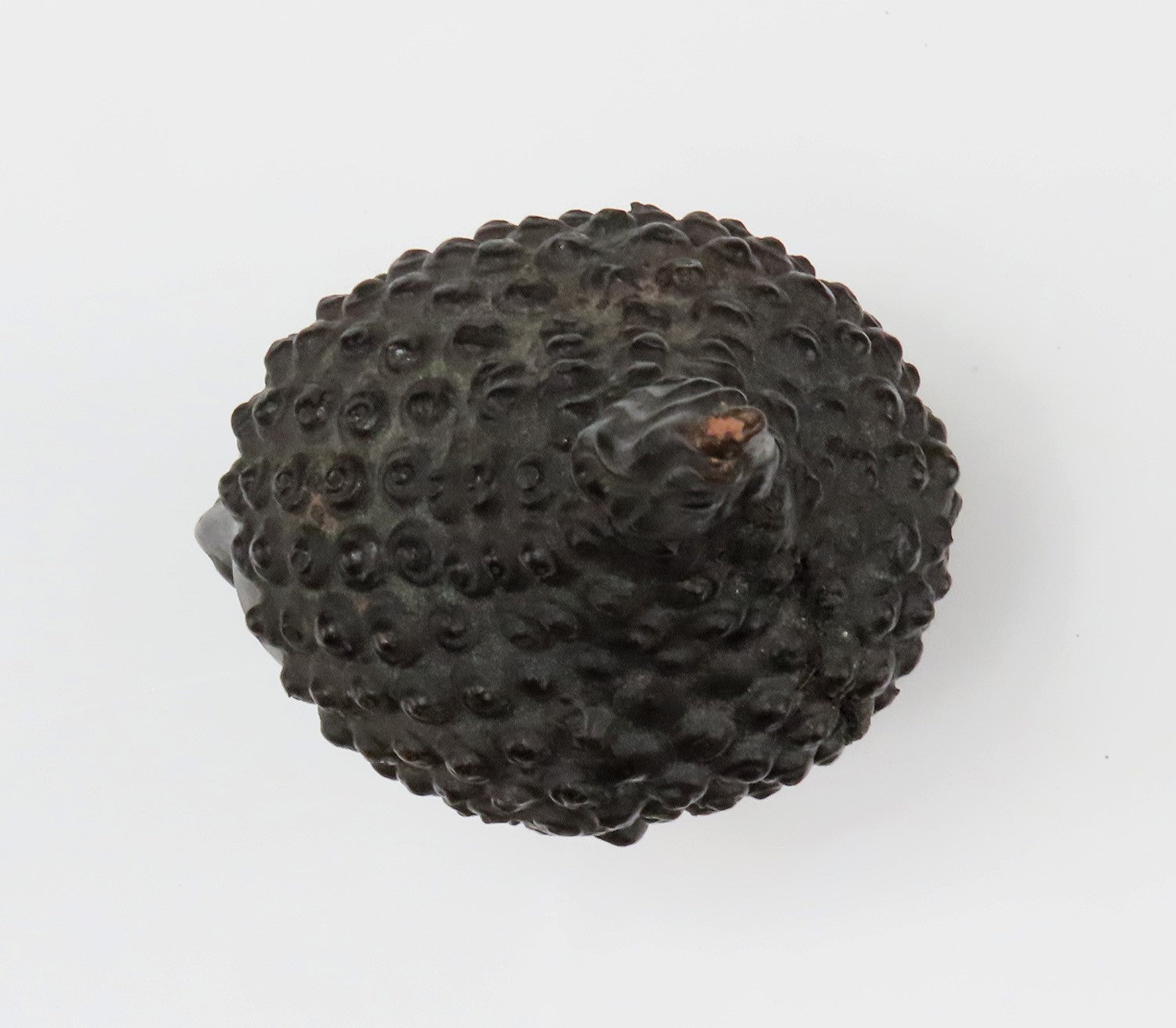 The figurine is in great condition. Some dust in the recesses, which could be cleaned up. Some spots of reddish brown, less vivid than the photos make it appear; the ones on the tip of the flame and beneath it seem more like residue than any corrosion, perhaps clay. The notch on the front of the neck may be in the making and would perhaps have been obscured by a base, but the figurine stands nicely on its own without a base today. This piece stands about 4 7/8 inches tall.