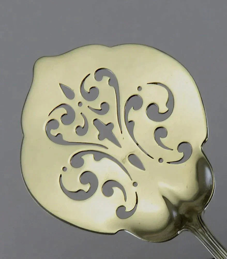 Presented is a rare, sterling silver tomato server made by Durgin during the early 1900s. This piece is done in the New Standish pattern, which was patented in 1905. The handle has a leaf accent at the tip and the base is pierced with a pretty design. The handle has never been monogrammed.