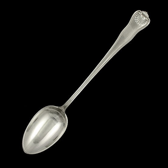 Presented is a sterling silver stuffing spoon of heavy weight made by the Frank W. Smith Company. This piece is in the Newport Shell a.k.a. Puritan pattern, which was patented in 1910. The thick handle has a beaded border and shell accent at the tip. The back of the handle has a monogram of the initials JSR. There is an old post on the back of the spoon. This is original construction. This posts was intended to prevent the spoon from sliding into a large serving bowl or roasting pan.