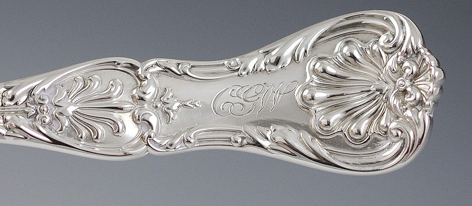 Presented is a fantastic Gorham sterling silver wide serving spoon in the King George pattern. The bowl of the spoon is quite wide, and has a gold wash. The handle of the spoon is monogrammed with 'CJW' in elegant script. This is a heavy and well-constructed piece of silver, and would be suitable for any general serving purpose.
