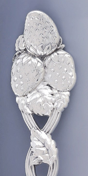 Presented is a fabulous Tiffany & Co sterling silver berry or casserole serving spoon. This piece is done in the charming Strawberry pattern. As the name suggests, this pattern has a strawberry motif, with a cluster of the berries and leaves adorning the handle. The spoon has a kidney shaped bowl with a gold wash.