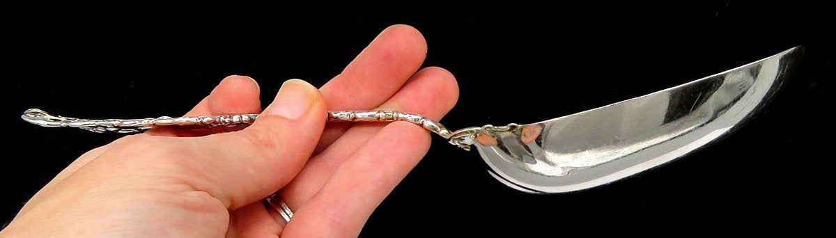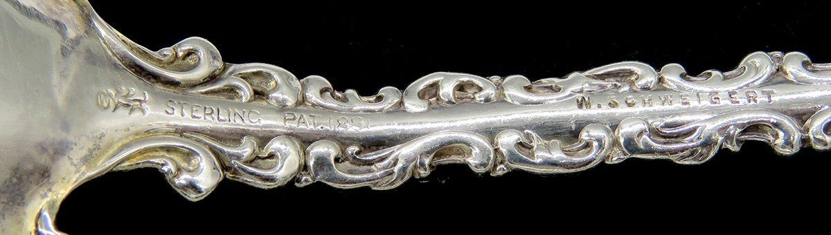 The back is marked for Whiting, sterling, patent 1891 and a retailer’s mark for W. Schweigert. This piece is in great overall condition and the designs are crisp. There is minor surface wear commensurate with age and use, but no damages and no repairs.