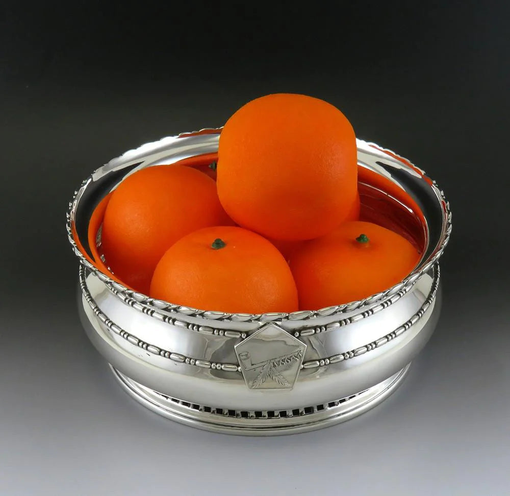 Presented is a one of a kind, solid sterling silver fruit bowl or serving dish made by Tiffany & Company during the first half of the 1900s. This bowl is of heavy weight and incredible quality. The foot rim has an openwork form and the bowl has bands of raised design around the middle and top. The front of the bowl has a separately cast and applied crest that is a pentagon with a Native American Indian peace pipe in the center. The bowl has never been monogrammed.