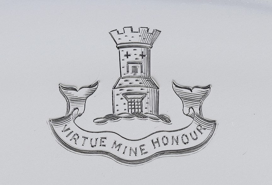 Presented is a lovely Tiffany & Co sterling silver plate or charger. This piece dates to 1907-1947. The dish is done in an elegant, simple form, with raised ribs around the edge. The plate has a finely engraved crest of tower above a banner reading 'Virtue Mine Honor.' This crest is associated with the Scottish MacLean clan.