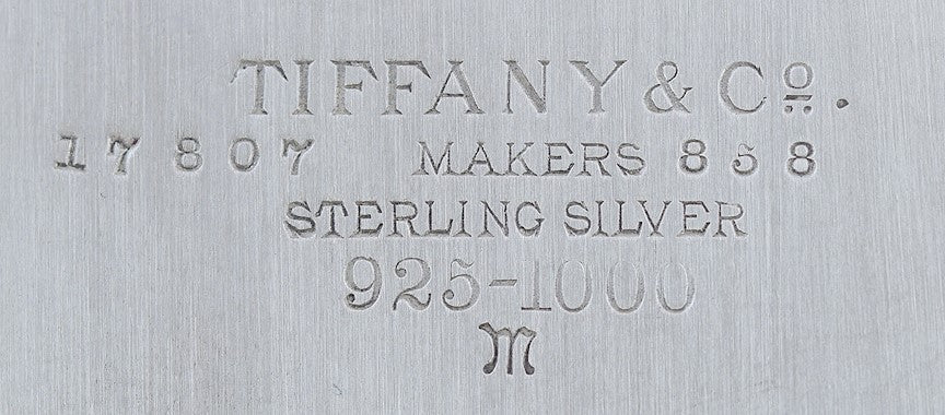 The underside of the piece is stamped with the Tiffany & Co. maker's mark, sterling 925-1000 and the initial 'M' for the company director between 1907-1947, John C. Moore II.
