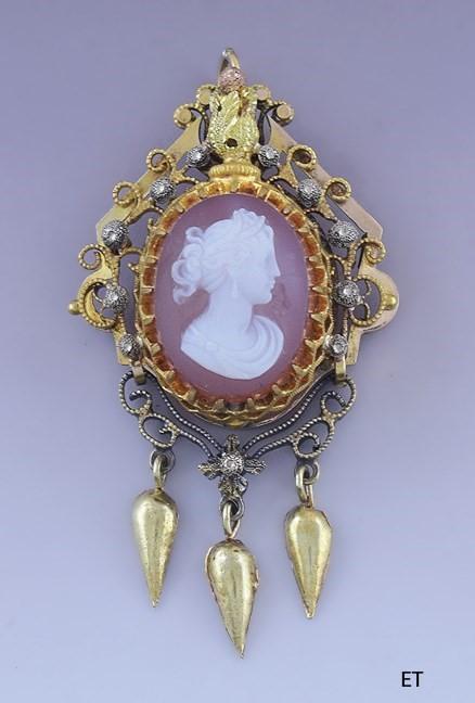 Presented is a lovely Victorian 14 karat gold carved hardstone cameo pendant. The central focus of the pendant is a beautifully carved cameo featuring a pretty woman in profile, in white against orange-red. The carving is very detailed and well done, depicting a woman with her hair done up and wearing a tiara. The cameo is set in an ornate gold frame, done in rose, yellow and green gold with detailed texturing and decoration. Hanging from the bottom of the pendant are three little gold pointed teardrop dangles. The pendant has a swiveling loop or bail at the top.