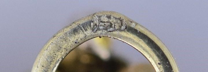 There is a stamp on the loop at the top, which is unfortunately too worn to read. We have tested this piece with nitric acid and guarantee it to be 14 karat gold.