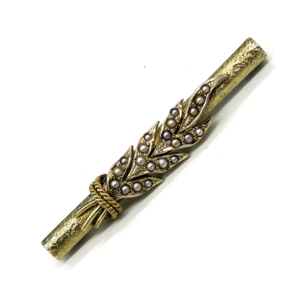 Antique Victorian Etruscan Revival 14K Yellow Gold Natural Pearl Leaf Rope Pin