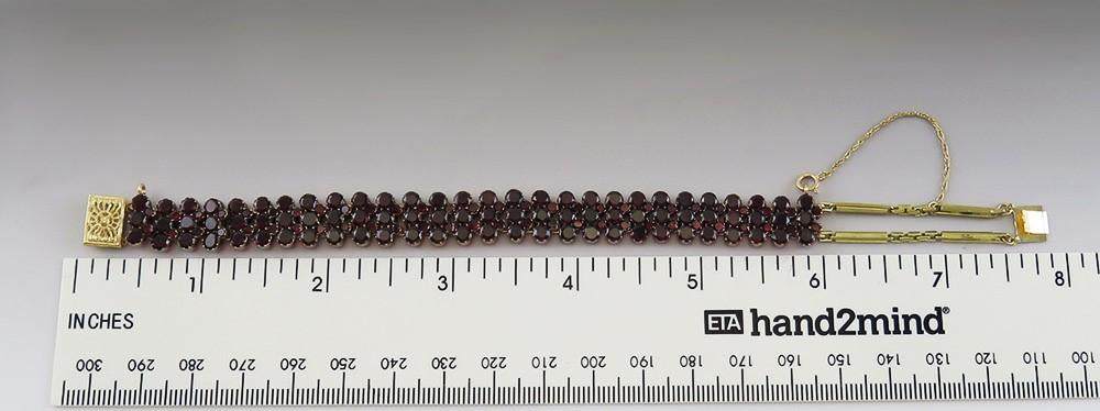 Presented is an antique gold filled garnet gemstone bracelet dating to the mid to late 1800s. This Victorian piece may be a mourning or memorial piece of jewelry. The bracelet is prong set with 84 garnets measuring 3.5 millimeters in diameter and 56 smaller garnets measuring 2 millimeters in diameter. The bracelet has been extended with gold filled links, which could easily be removed by your local jeweler.