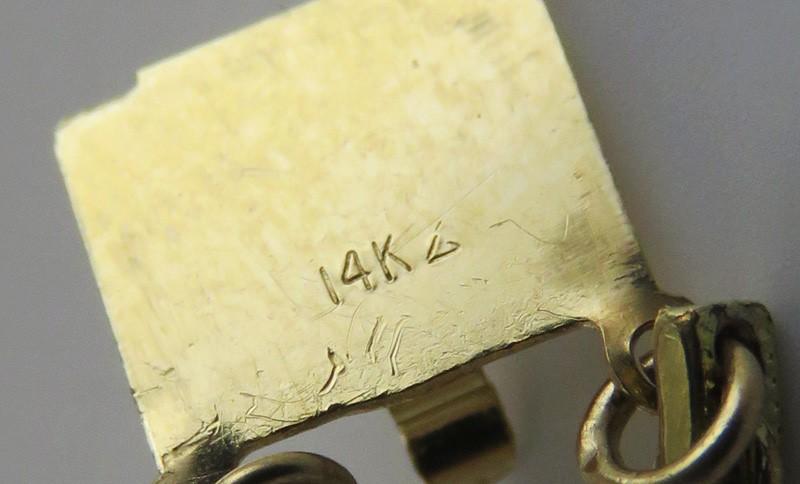 The clasp is a tab insert box style in a lovely filigree openwork design, with a springring safety chain on the side. Both clasps are quite secure. The box clasp is stamped and guaranteed 14k on the tab. The springring clasp is also stamped 14k, and we have tested the safety chain itself and guarantee it to be 14 karat gold as well. The extender links are gold filled. The bracelet itself seems to be a very low carat gold, less than 9k.
