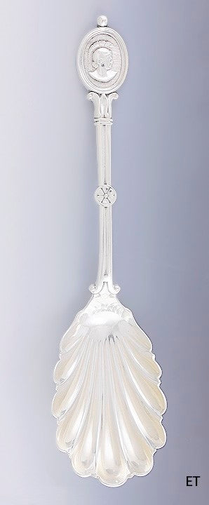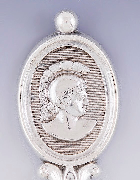 Presented is a fine old sterling silver serving spoon or scoop by John Wendt or possibly Gorham. This piece is done in the Medallion pattern, which began production in 1864. As the name suggests, this pattern features a medallion design for the end of the handle, with a classical Greco-Roman style profile in the center of the medallion. This particular piece has a helmeted soldier's profile, very well done down to the detail of the plume on his helmet. The bowl of the scoop has a ribbed/scalloped design. The back of the handle has a monogram of HFH.