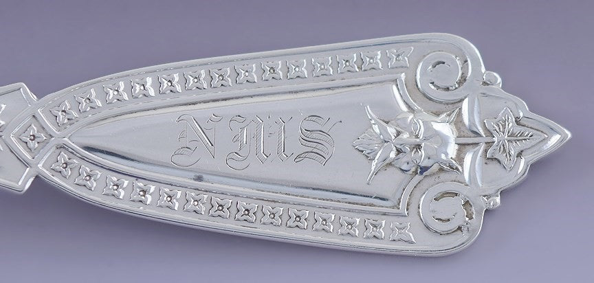 Presented is a wonderful Whiting sterling silver serving spoon. This piece is made in the Ivy pattern, which began production in 1865. As the name suggests, the pattern features a design of ivy leaves around the handle, surrounding an interesting imp mask design. The handle has a monogram of NMS in Gothic script.