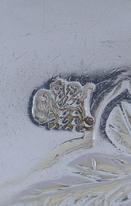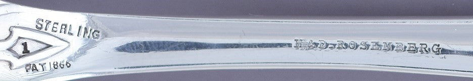 The piece is stamped with the Whiting maker's mark on the back of the bowl, with sterling as well as a patent date of 1865 and a retail mark of H & D Rosenberg on the stem.