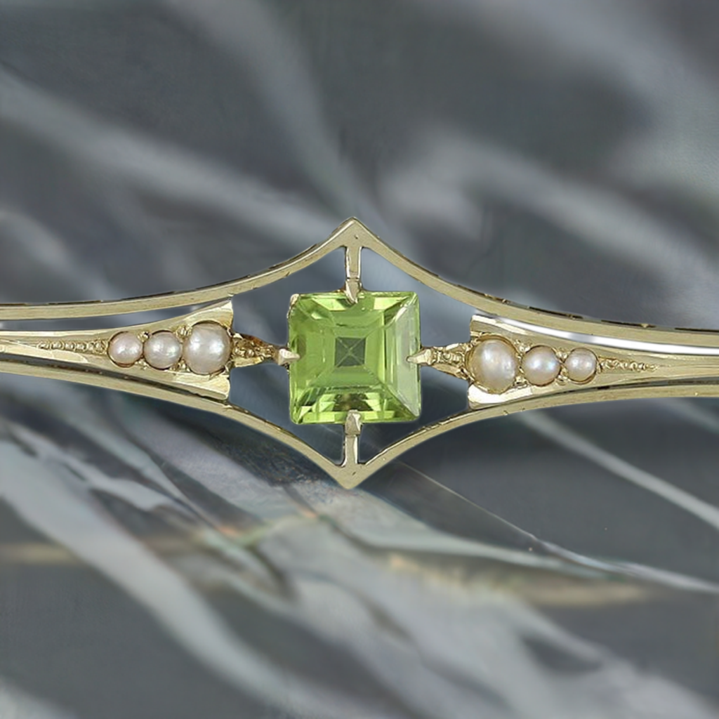 Art Deco c1900-1920s 14k Yellow Gold Peridot Pearl Bar Pin Brooch