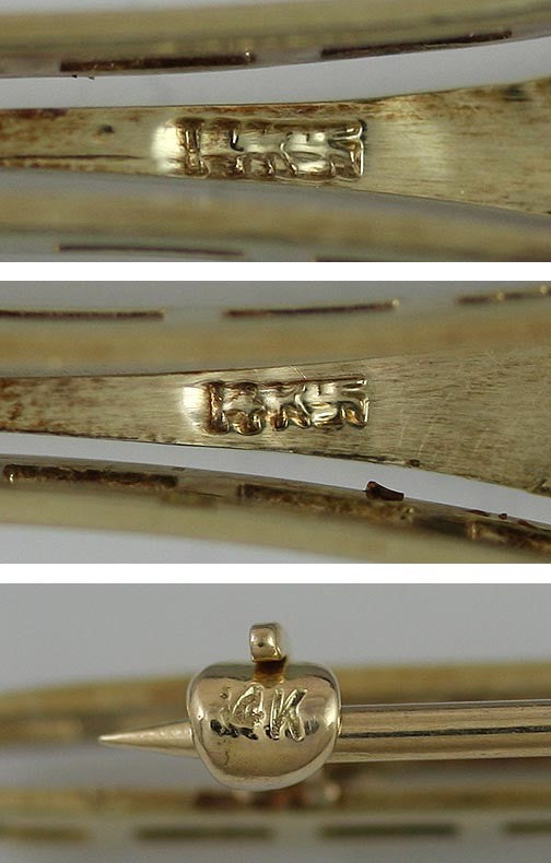 The pin is stamped 14K on the clasp. It is also stamped 14 karat in two other locations. We have tested it with nitric acid and guarantee it to be 14K gold.