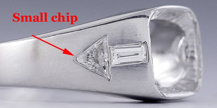This piece is in excellent overall condition. One of the triangle cut diamonds has a tiny chip on it but this is only noticeable upon very close inspection using a jeweler's loupe.