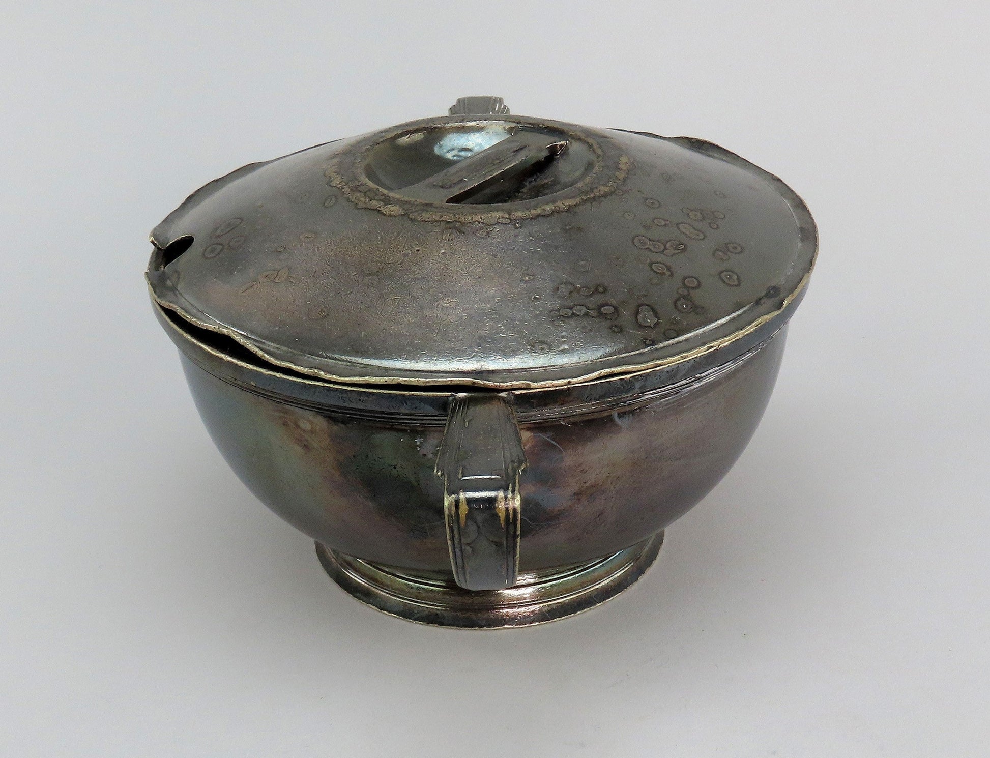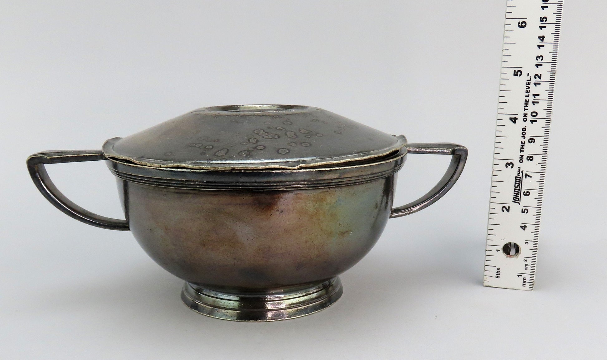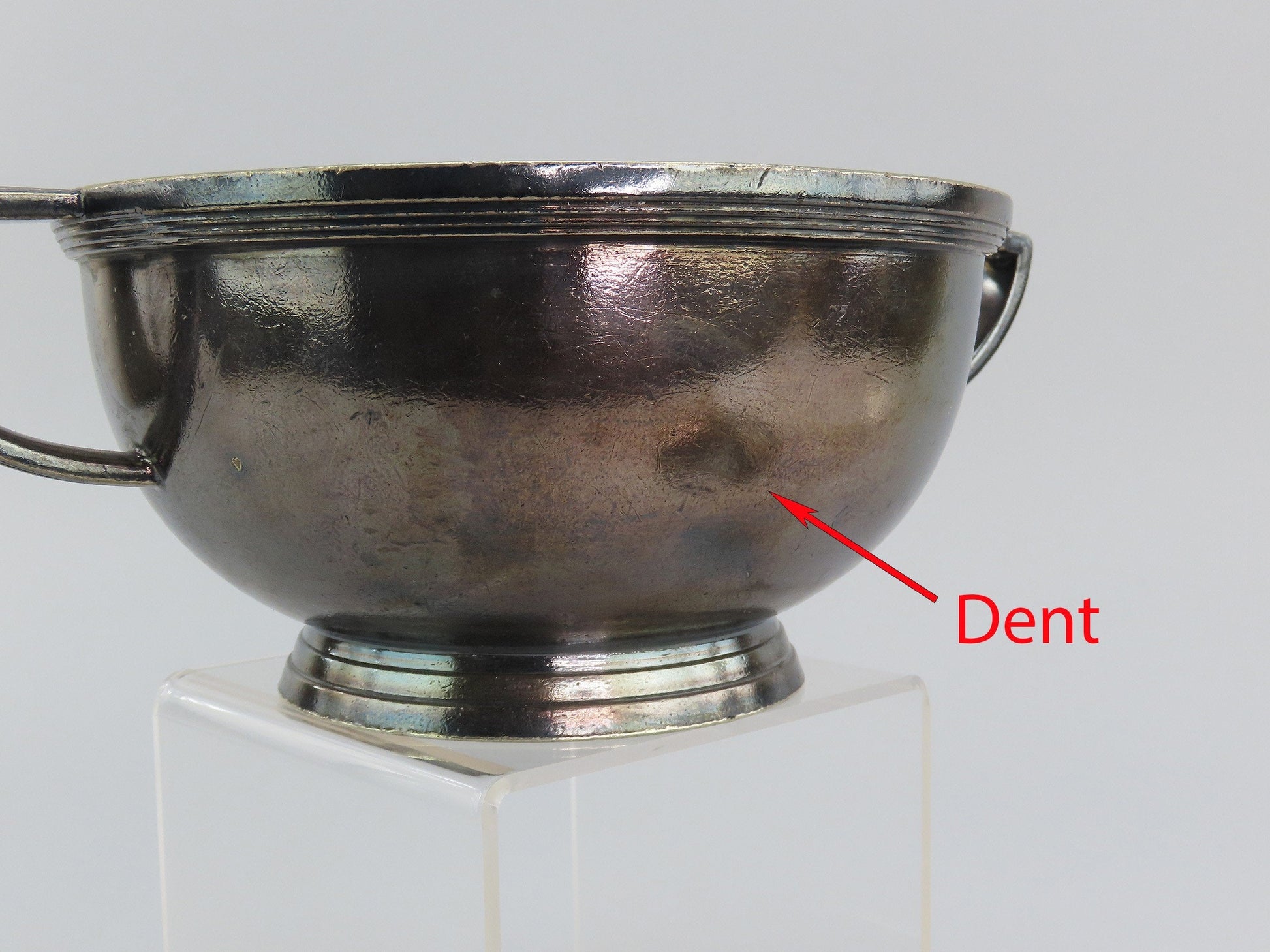 This piece is in AS IS condition, likely from a lot of use. There is a dent on the side of the bowl and surface scratches throughout the piece. The lid has dents and ripples on the edge which are represented well in the photos. The piece has no monograms, no monogram removals, no breaks, and no repairs.