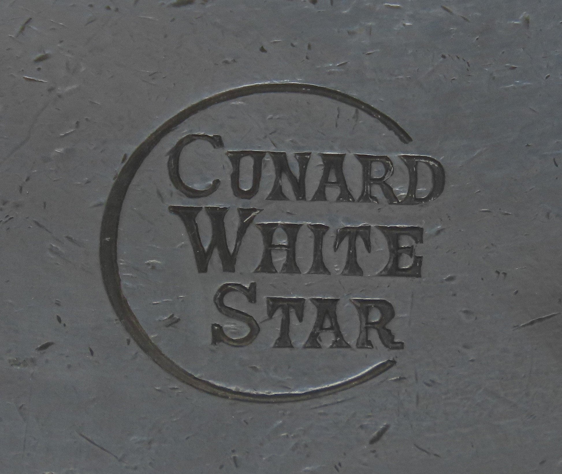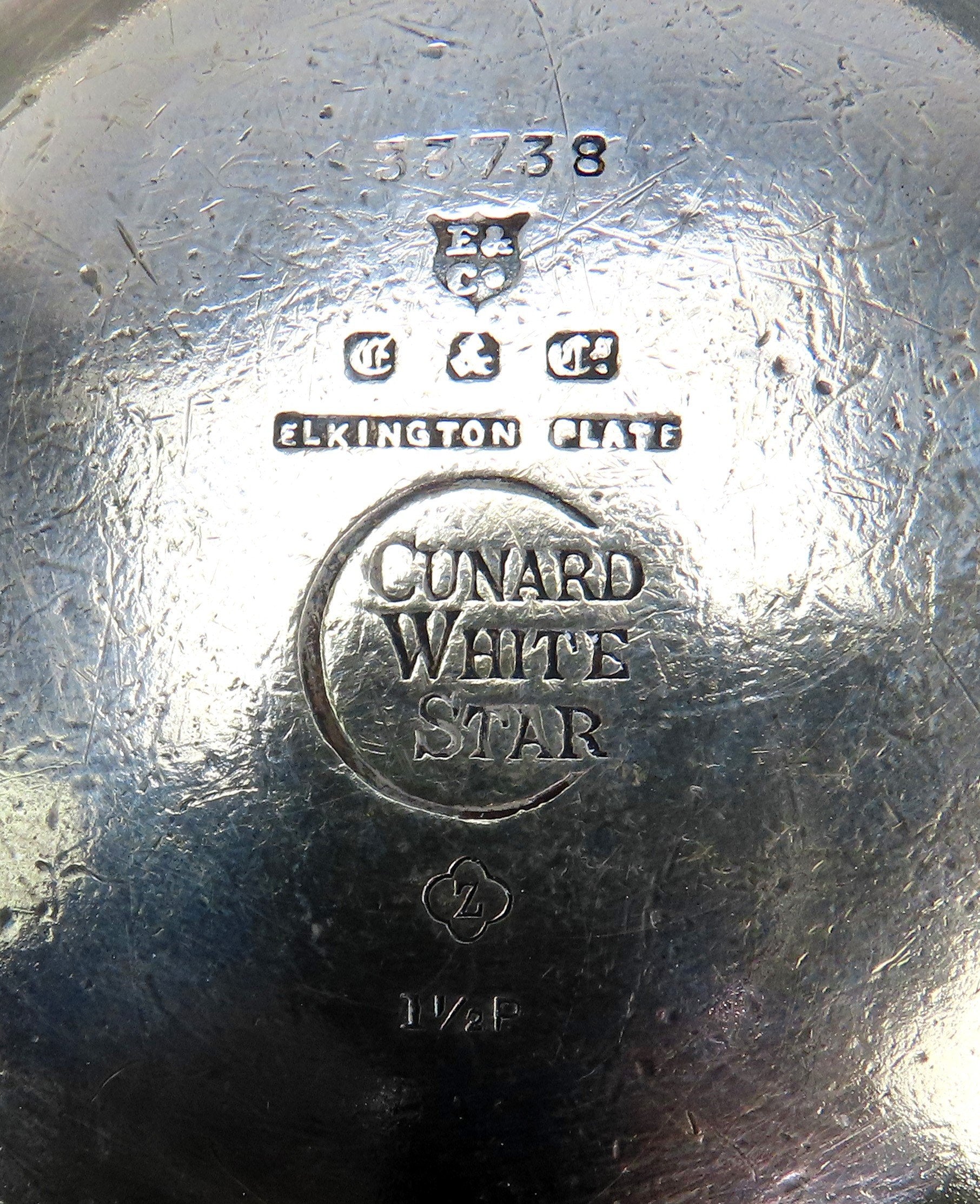 The underside of the piece is marked silverplated along with the maker's mark for Elkington & Co. The piece is also marked with “Cunard White Star” and with 1 1/2 Pints.